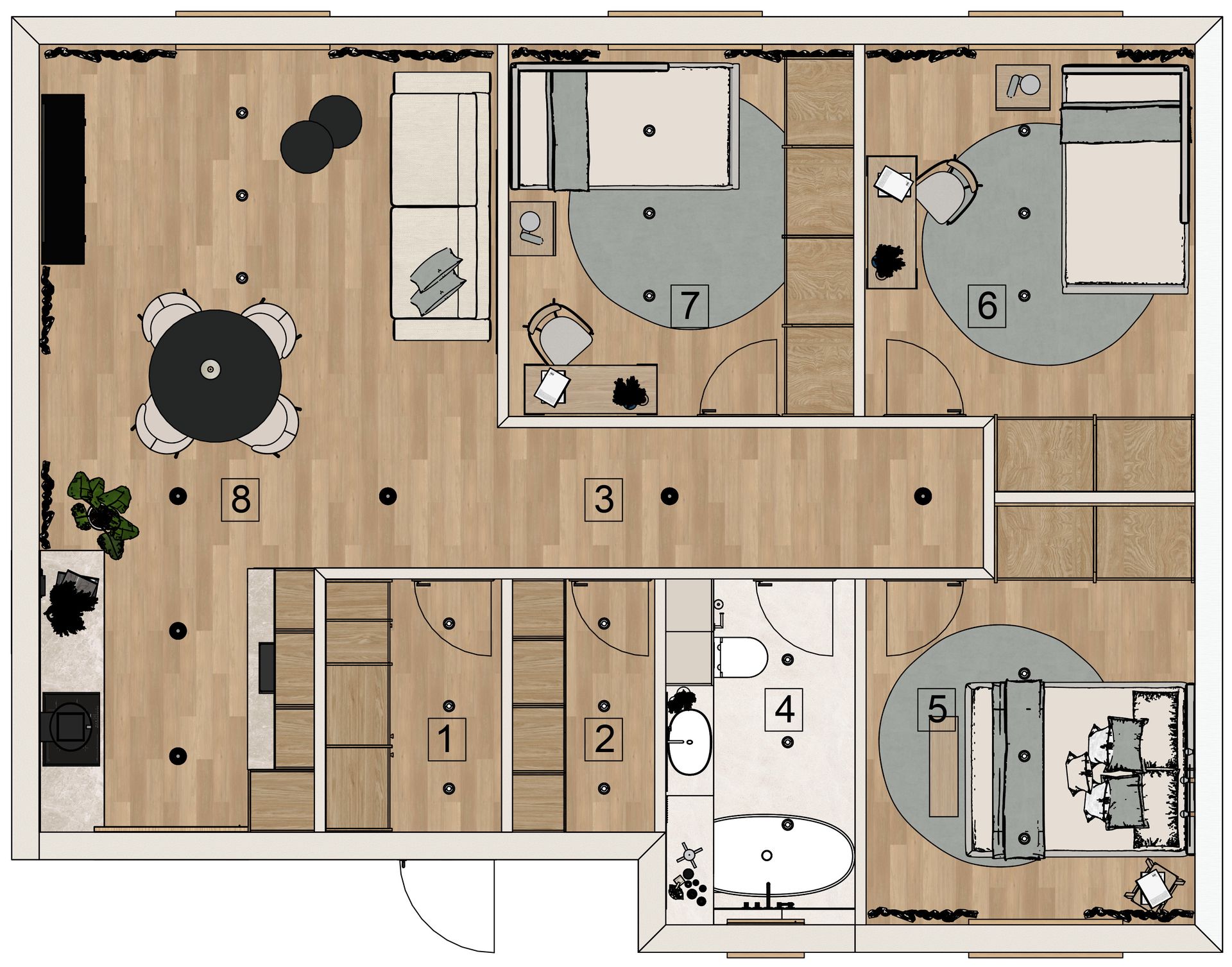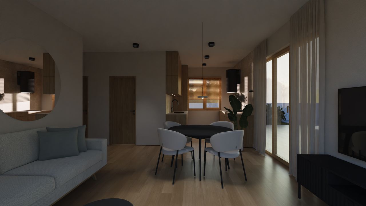 Po przekroczeniu progu domu, wita nas funkcjonalny wiatrołap, który prowadzi do serca domu – przestronnej strefy dziennej, łączącej pokój dzienny z kuchnią i jadalnią. To otwarte wnętrze o powierzchni 25,8 m² stanowi idealne miejsce do wspólnego spędzania czasu i celebrowania posiłków. Komfort codziennego życia podnosi praktyczne pomieszczenie gospodarcze, zapewniające dodatkową przestrzeń do przechowywania. Na parterze znajdują się również trzy komfortowe pokoje, które mogą pełnić funkcję sypialni dla domowników lub elastycznie adaptować się jako gabinet czy pokój gościnny. Całość uzupełnia wygodna łazienka, dostępna z korytarza, zapewniająca pełną funkcjonalność dla całej rodziny.