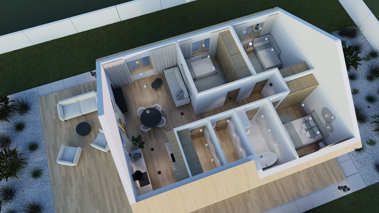 Wnętrze domu o powierzchni użytkowej 75,95 m² zostało zaprojektowane z myślą o maksymalnej funkcjonalności i komforcie. Na tej przestrzeni mieści się łącznie 3 pokoje oraz 1 łazienka, zapewniając wygodę dla rodziny 2+1 lub 2+2.