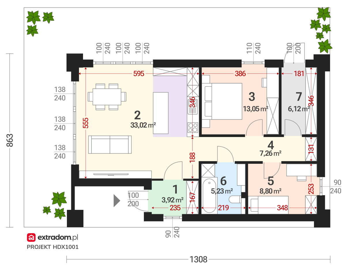 - Pokój dzienny + kuchnia + jadalnia – 33,02 m²