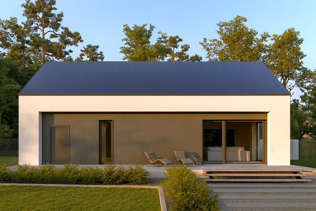 Dom prefabrykowany DEX76 to przykład nowoczesnej architektury jednorodzinnej. Jego prosta, wolnostojąca bryła z dwuspadowym dachem o kącie nachylenia 32° doskonale wpisuje się w aktualne trendy. Elewacja wykończona tynkiem silikonowo-silikatowym nadaje budynkowi estetyczny i trwały wygląd. Charakterystycznym elementem jest innowacyjne pokrycie dachu, łączące tradycyjną blachę na rąbek z aktywną połacią solarną, co podkreśla ekologiczny i futurystyczny charakter projektu, a także jego zaawansowanie technologiczne. Całość tworzy spójną i funkcjonalną przestrzeń o wysokości 6,90 m, idealnie wkomponowującą się w otoczenie.