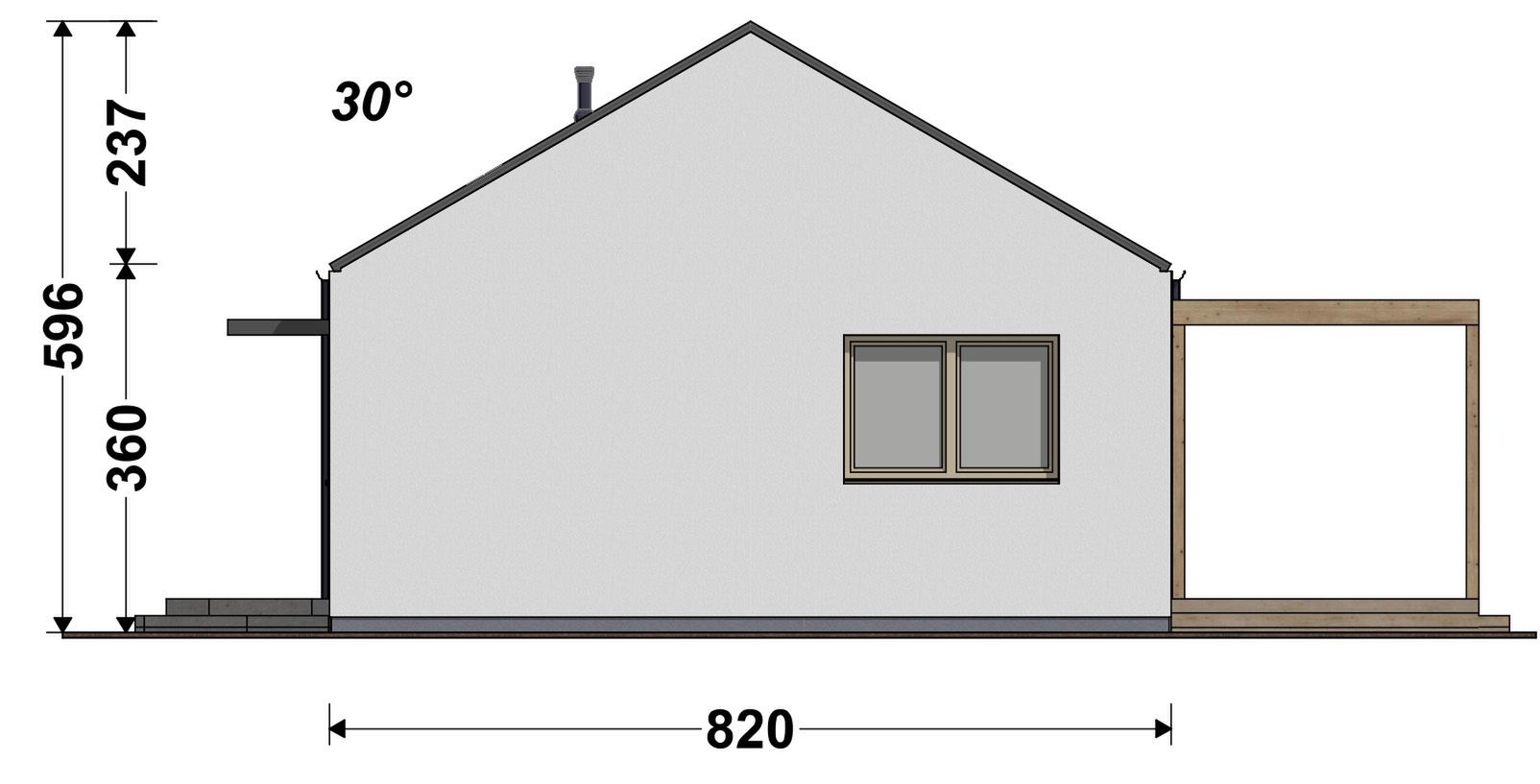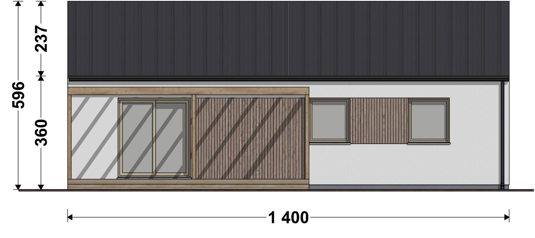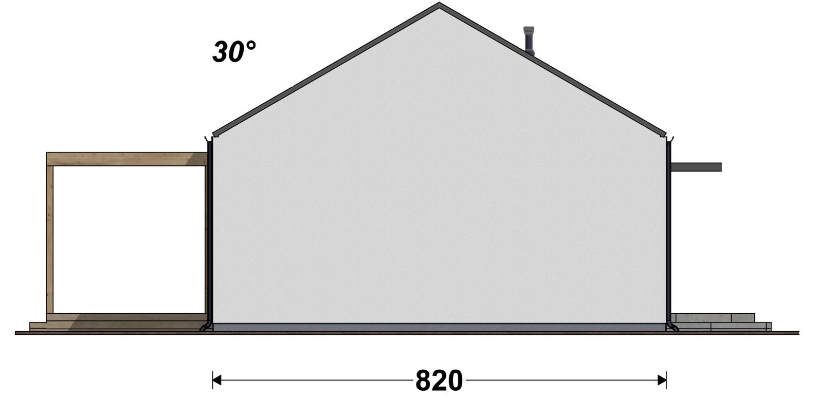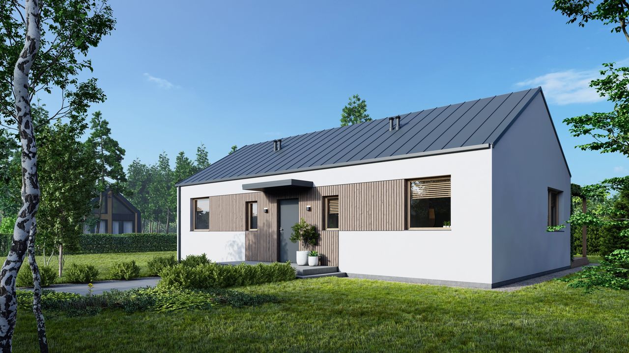 Dom prefabrykowany DH115 prezentuje nowoczesną i minimalistyczną bryłę, która doskonale wpisuje się w aktualne trendy architektoniczne. Prosta forma z dwuspadowym dachem o kącie nachylenia 30°, pokrytym blachą na rąbek, zapewnia nie tylko estetyczny wygląd, ale także ekonomiczną i trwałą konstrukcję. Elewacja wykończona tynkiem podkreśla współczesny charakter budynku, tworząc spójny i elegancki wizerunek. Kompaktowe wymiary (14 m szerokości i 8,20 m długości) sprawiają, że dom jest idealny na działki o minimalnej szerokości 21 m i długości 16,20 m.