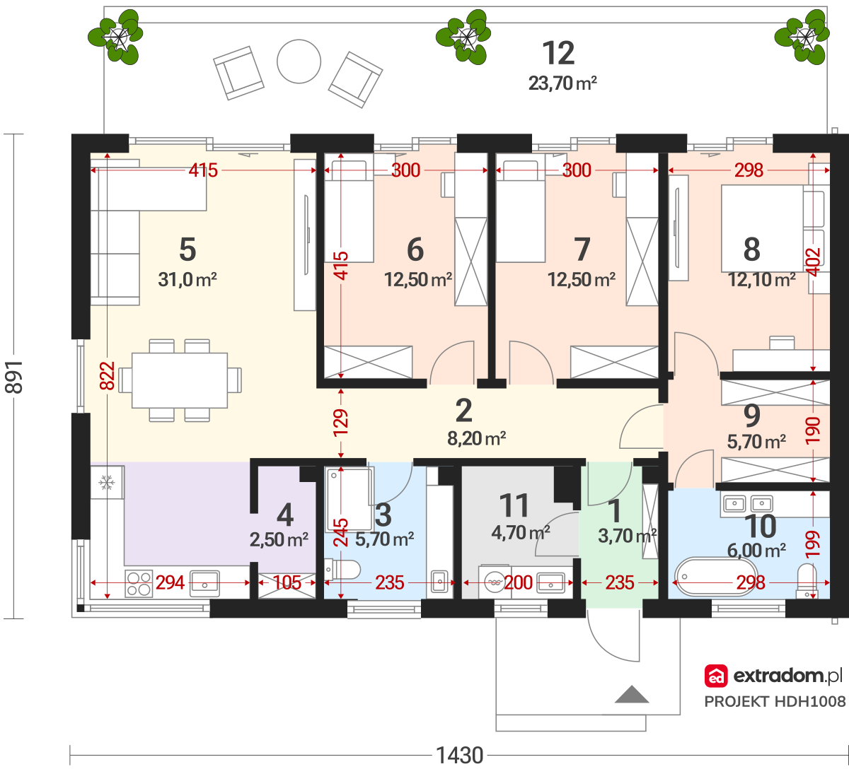 - Komfortowy taras – Przestronny taras o powierzchni 23,7 m² stanowi idealne miejsce do wypoczynku na świeżym powietrzu, spotkań z bliskimi i cieszenia się otoczeniem domu.
