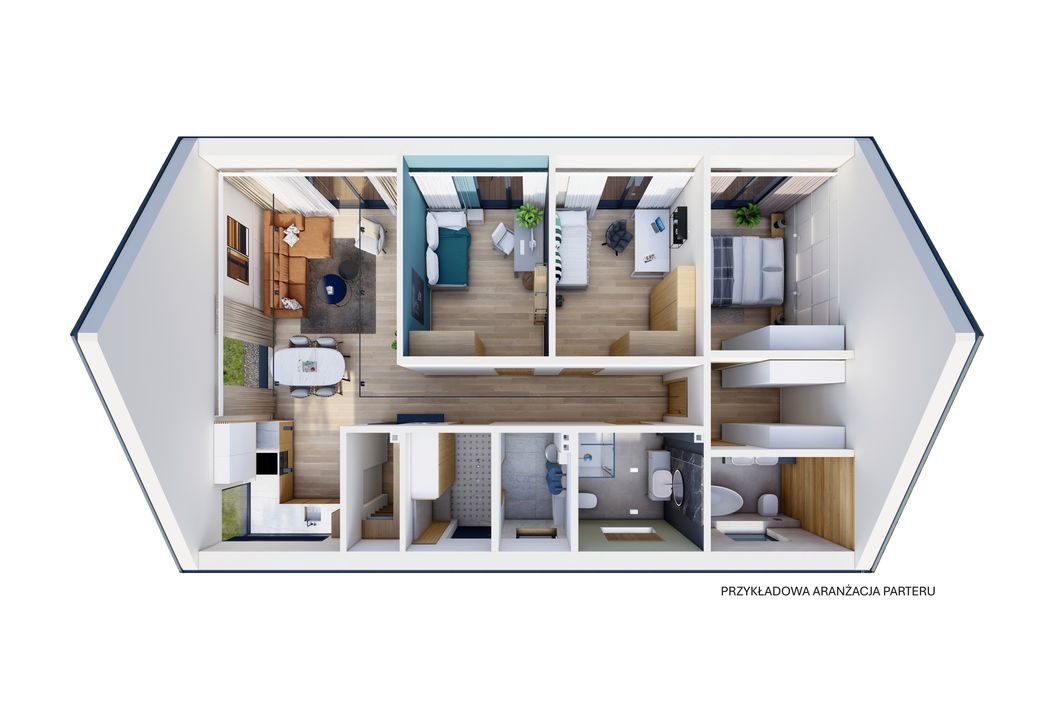 Wnętrze Domu prefabrykowanego DH127 o powierzchni użytkowej 104,71 m² zostało zaprojektowane z myślą o maksymalnym komforcie i funkcjonalności dla 3-4 osobowej rodziny. Na parterze znajdują się trzy pokoje, dwie łazienki oraz przestronna strefa dzienna, tworząc spójną i wygodną przestrzeń do życia.