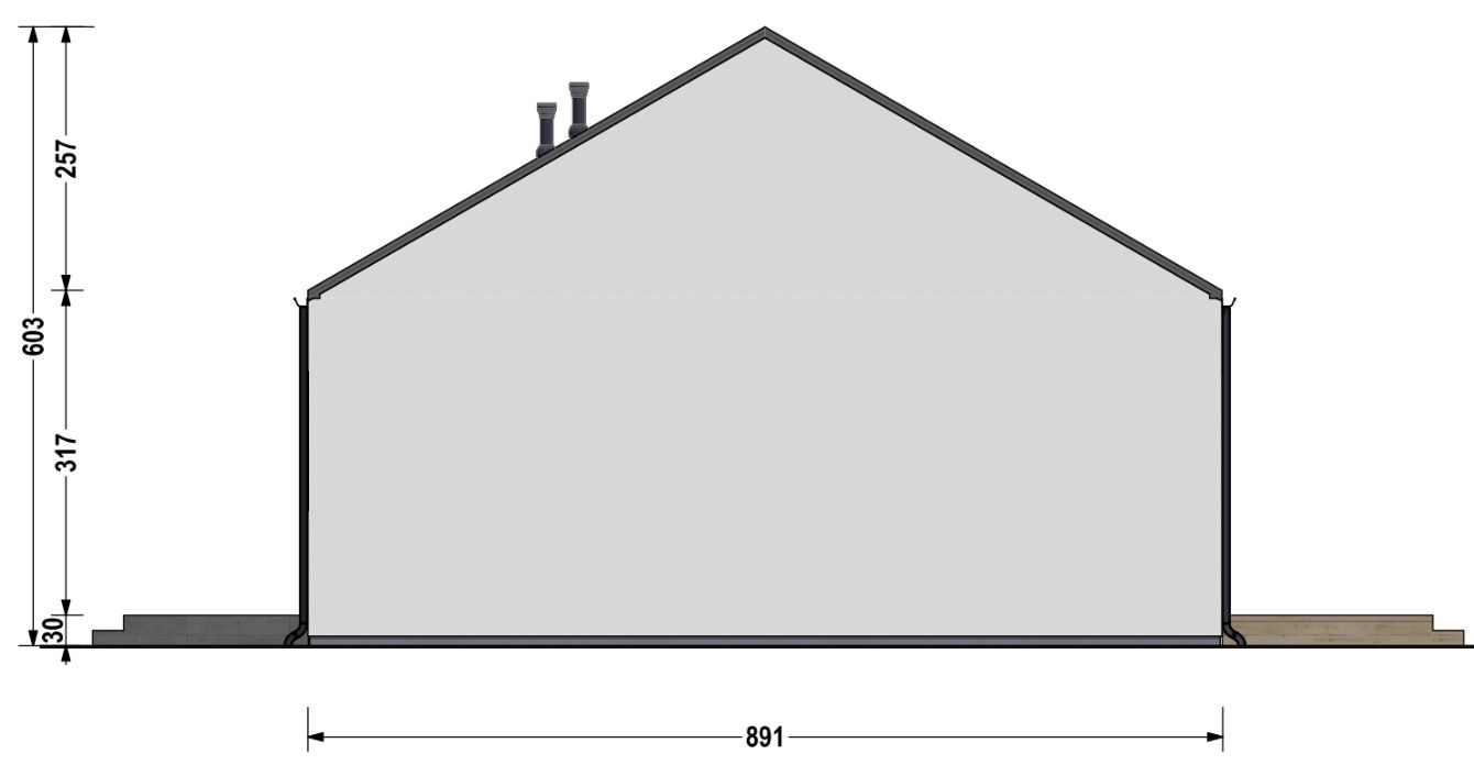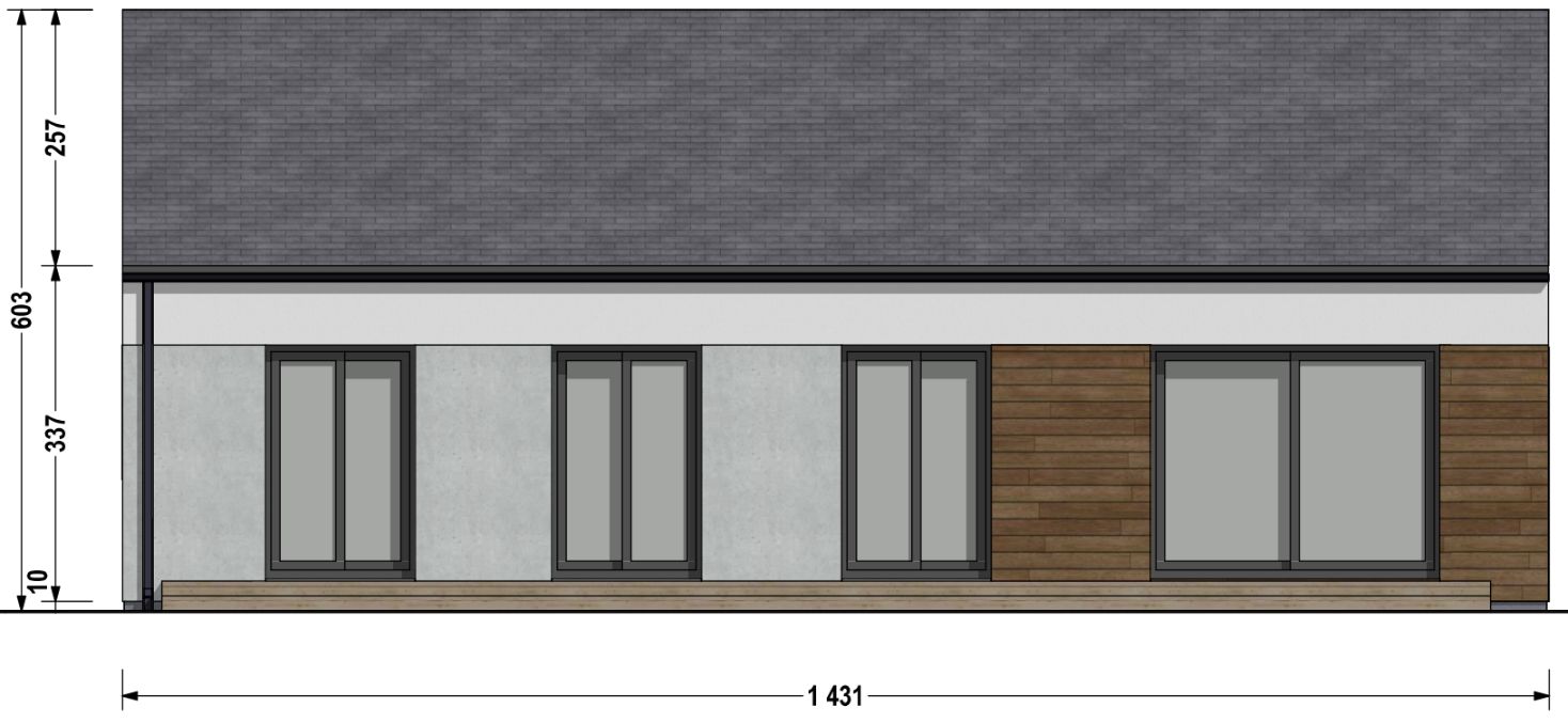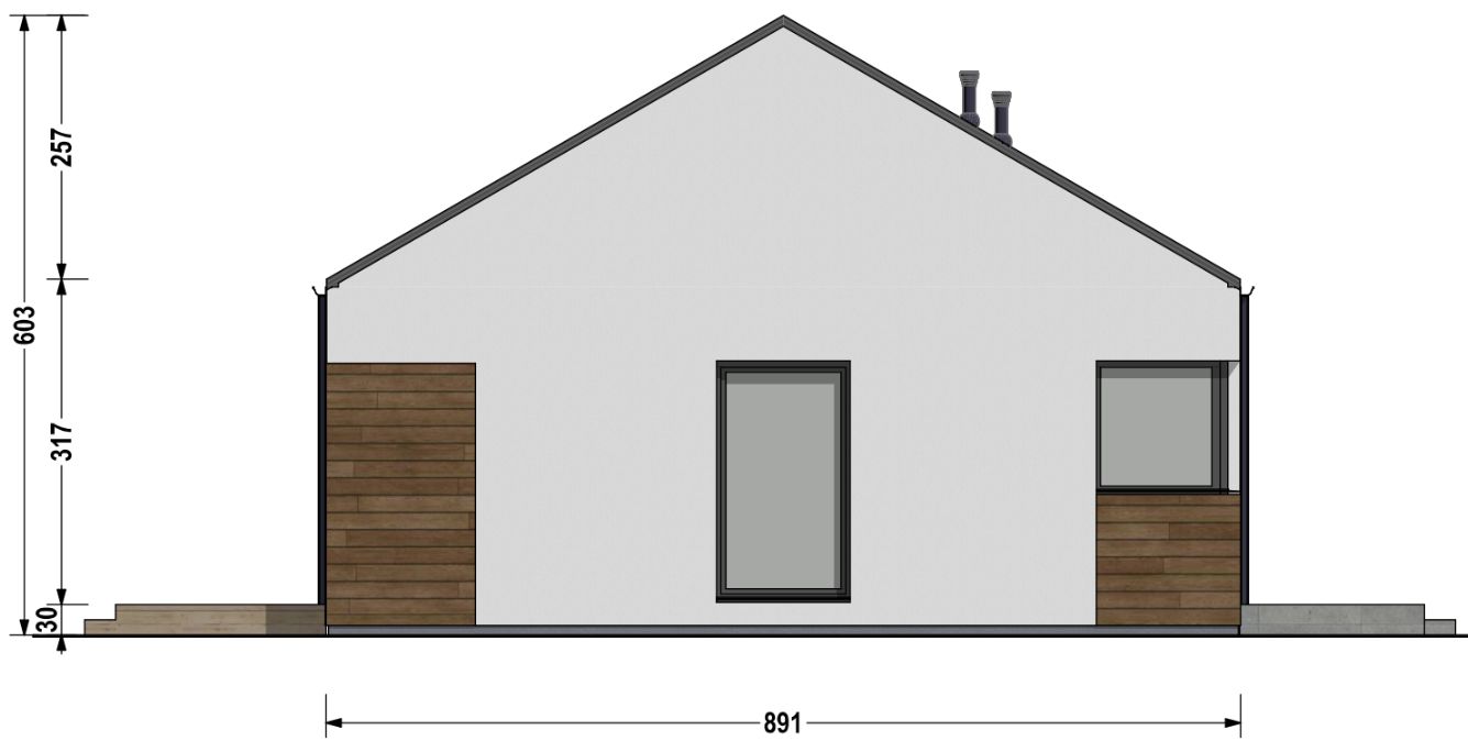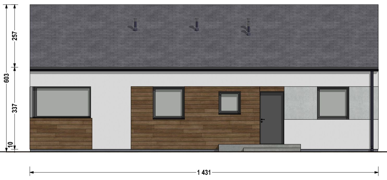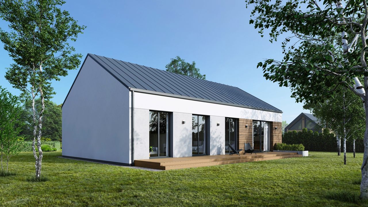 Dom prefabrykowany DH127 prezentuje nowoczesny styl, charakteryzujący się prostą, parterową bryłą z dwuspadowym dachem o kącie nachylenia 30°. Elewacja wykończona tynkiem podkreśla minimalistyczny charakter budynku, a harmonijne proporcje o szerokości 14,30 m i długości 8,90 m sprawiają, że dom doskonale wpisuje się w otoczenie. Brak zbędnych detali architektonicznych oraz klarowny design zapewniają estetyczny i ponadczasowy wygląd.