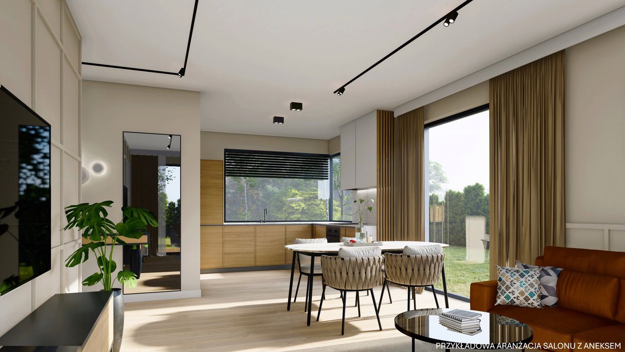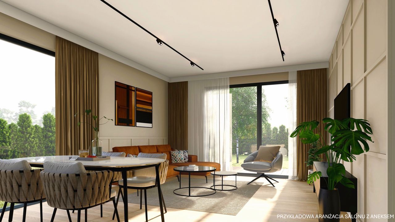 Po przekroczeniu progu domu, przez wygodny wiatrołap, wkraczamy do funkcjonalnego korytarza, który prowadzi do wszystkich części domu. Sercem parteru jest otwarta i przestronna strefa dzienna, łącząca pokój dzienny z kuchnią i jadalnią. To idealne miejsce do wspólnego spędzania czasu, gotowania i celebrowania posiłków. Tuż przy kuchni znajduje się praktyczna spiżarnia, ułatwiająca przechowywanie zapasów i utrzymanie porządku. Z salonu jest bezpośrednie wyjście na przestronny taras o powierzchni 23,7 m², który stanowi naturalne przedłużenie strefy dziennej i zaprasza do relaksu na świeżym powietrzu.