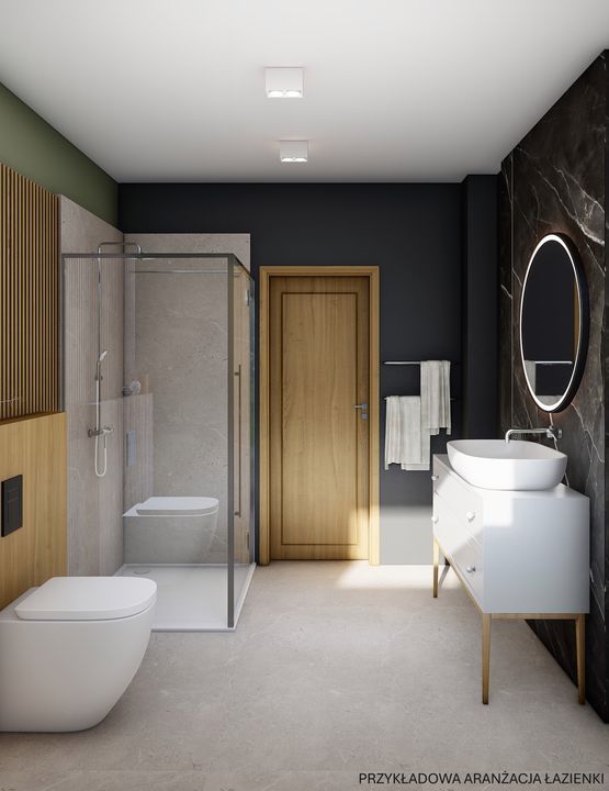 - Praktyczne udogodnienia – Wygodę codziennego życia podnoszą takie elementy jak spiżarnia tuż przy kuchni, oddzielna pralnia z kotłownią oraz pojemna garderoba, zapewniające porządek i funkcjonalność.
