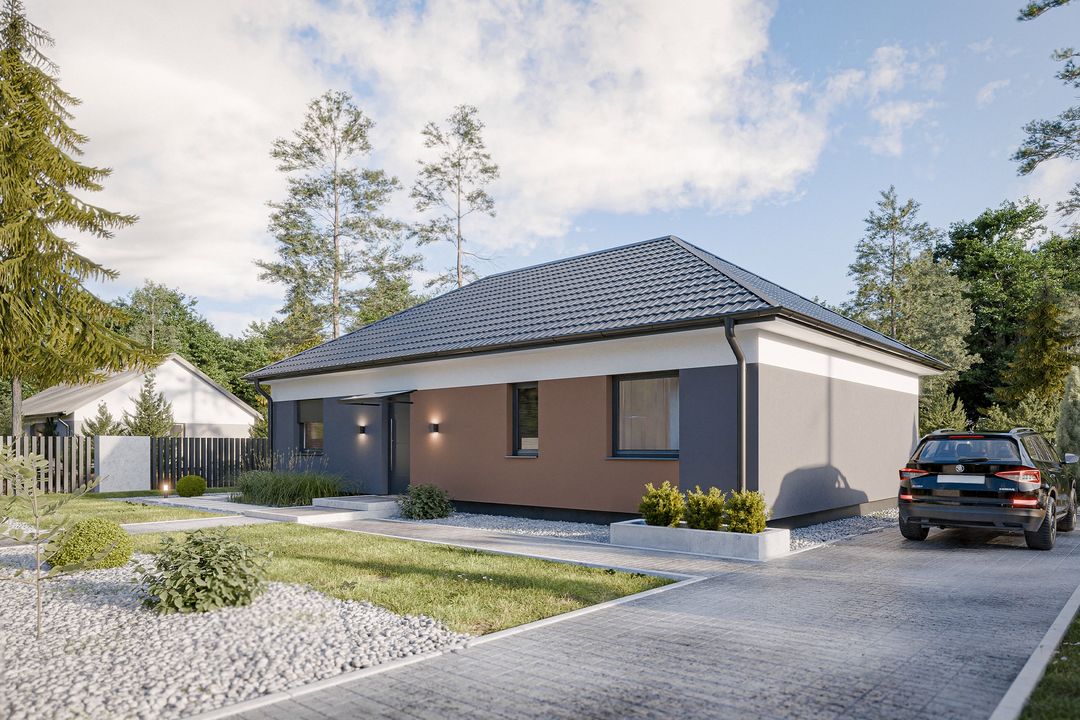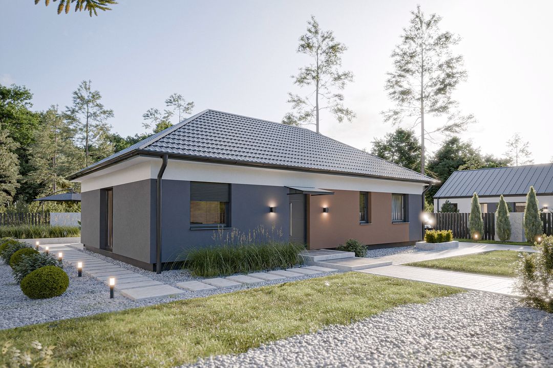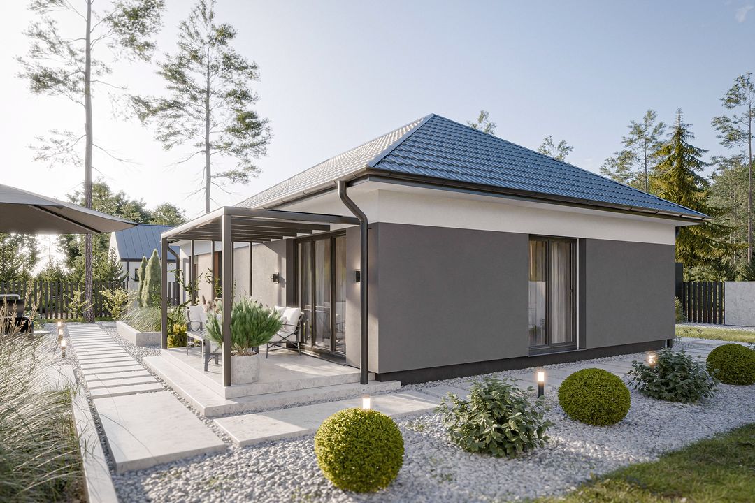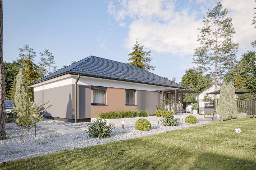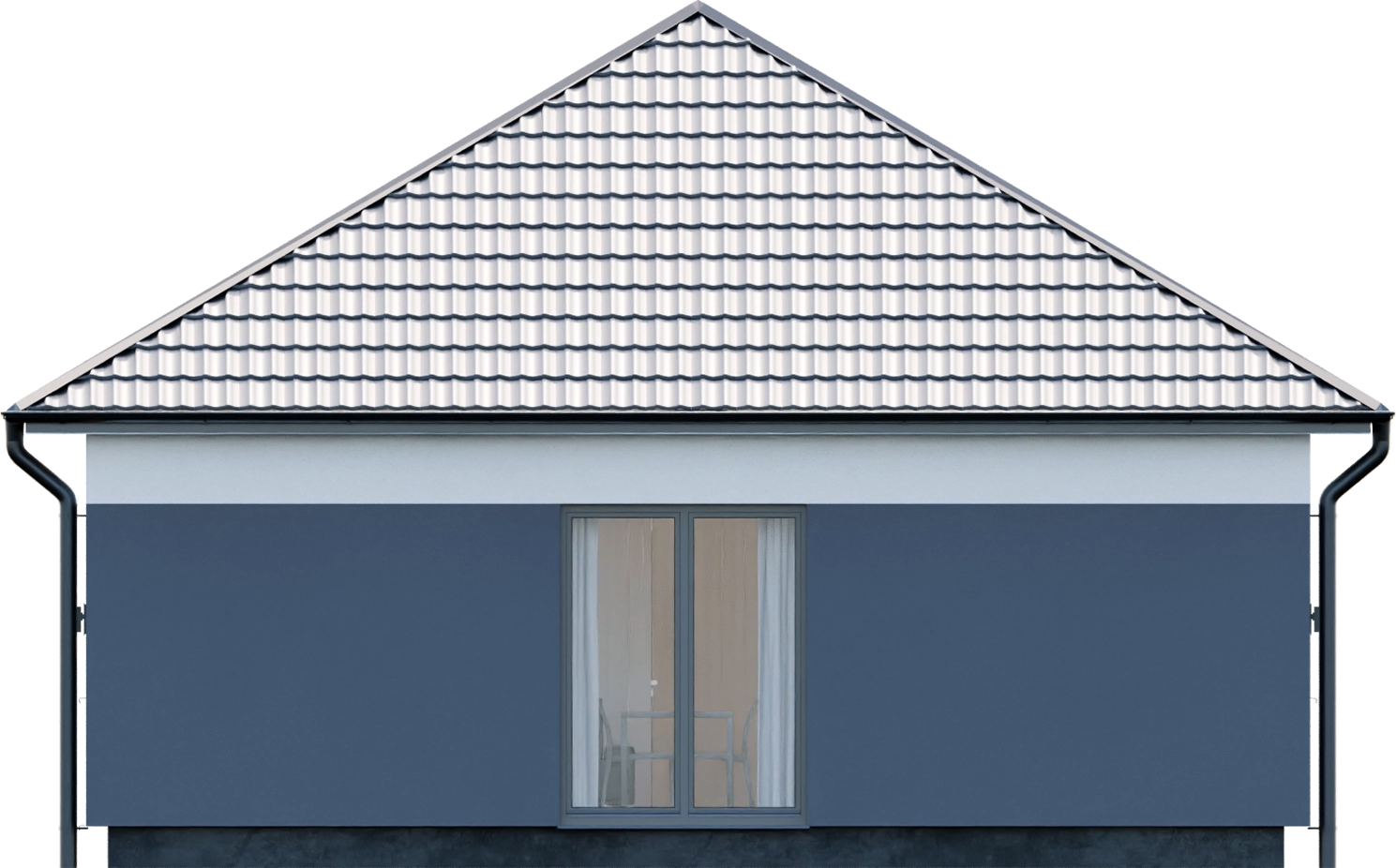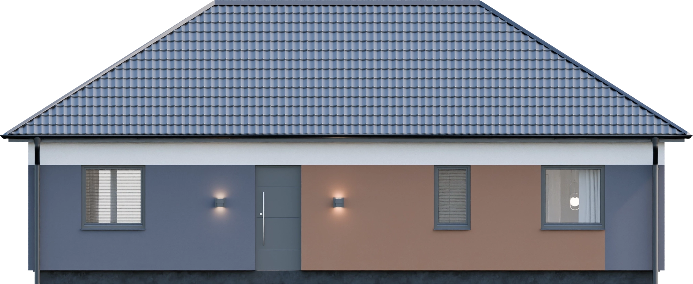 Dom prefabrykowany Parterowy 100B prezentuje się w tradycyjnym stylu, charakteryzującym się prostą i elegancką bryłą. Całość wieńczy klasyczny dach kopertowy o kącie nachylenia 35°, pokryty blachodachówką, co nadaje budynkowi harmonijny i ponadczasowy wygląd. Elewacja, choć wykonana w nowoczesnej technologii prefabrykacji betonowej, doskonale wpisuje się w estetykę tradycyjnego budownictwa, oferując jednocześnie wysoką trwałość i efektywność energetyczną. Wysokość budynku wynosi 6,71 m, a jego kompaktowe wymiary (szerokość elewacji 13,86 m, długość elewacji 8,72 m) sprawiają, że idealnie pasuje na działki o minimalnej szerokości 20,90 m i długości 16,80 m.