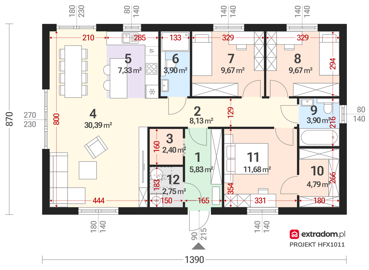 - Funkcjonalny podział stref – Projekt wyraźnie rozgranicza strefę dzienną od nocnej, zapewniając prywatność i komfort wszystkim domownikom, mimo że wszystko znajduje się na parterze.