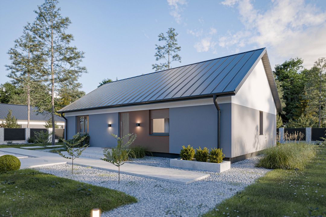Ten parterowy dom oferuje 100,44 m² powierzchni użytkowej, na której rozmieszczono 3 pokoje i 2 łazienki, zapewniając wygodę i funkcjonalność dla całej rodziny.