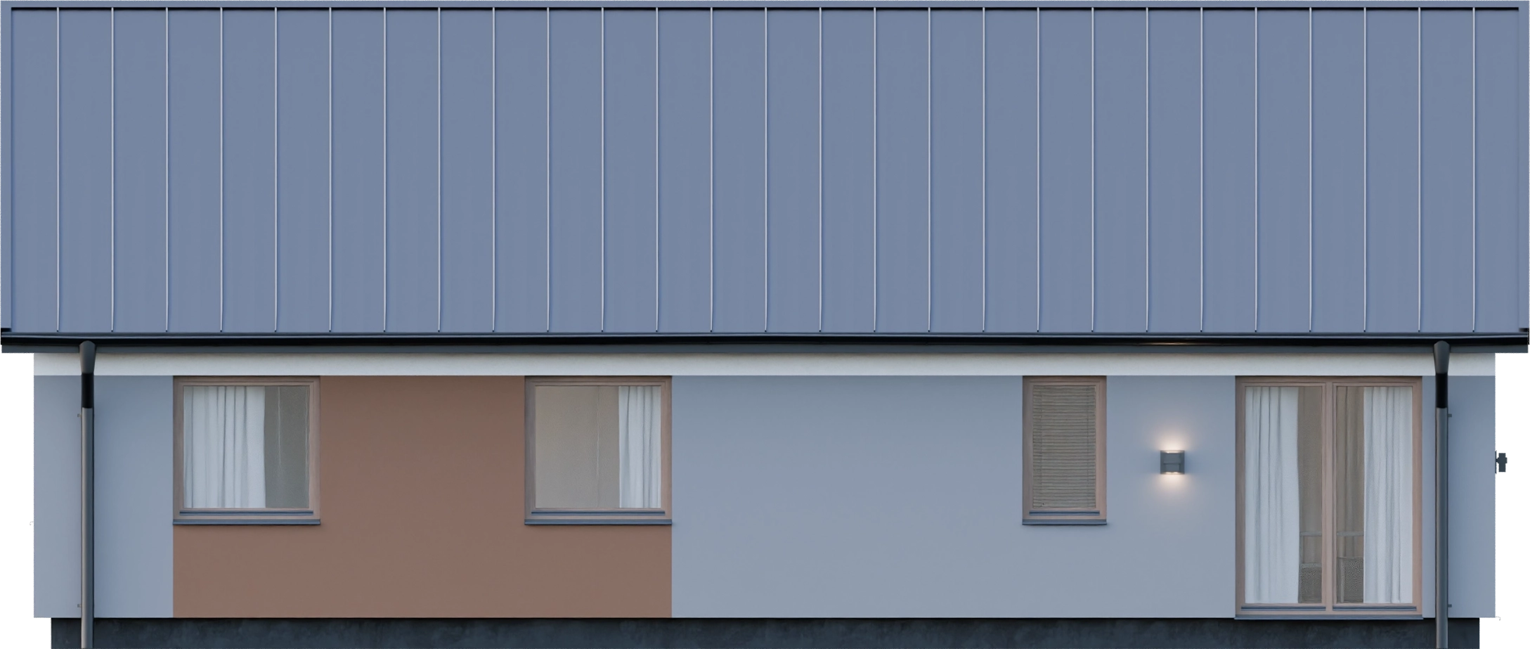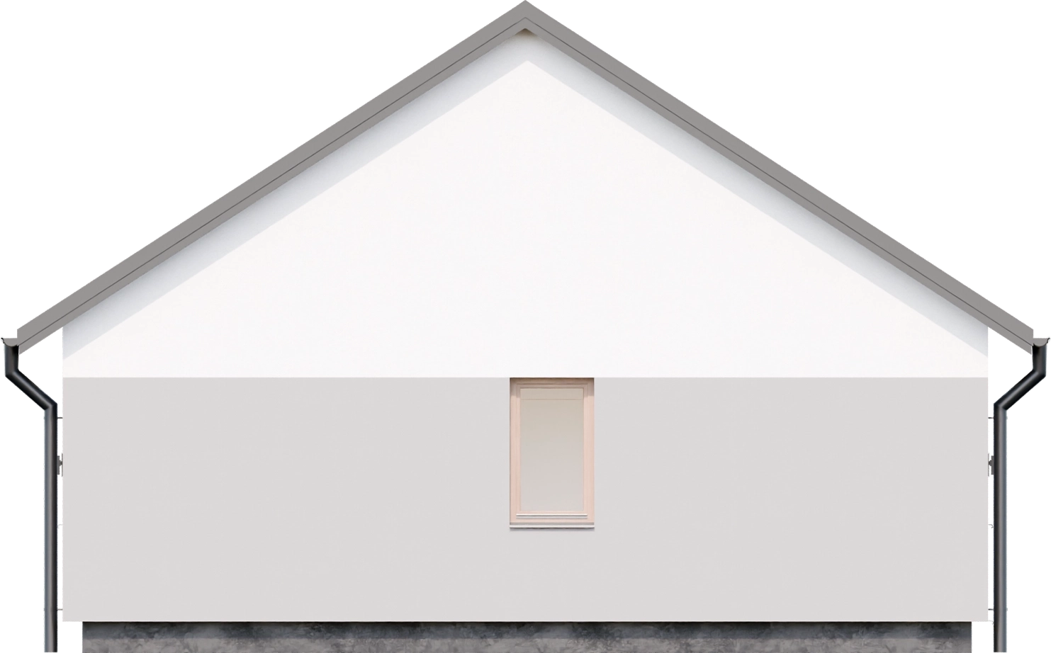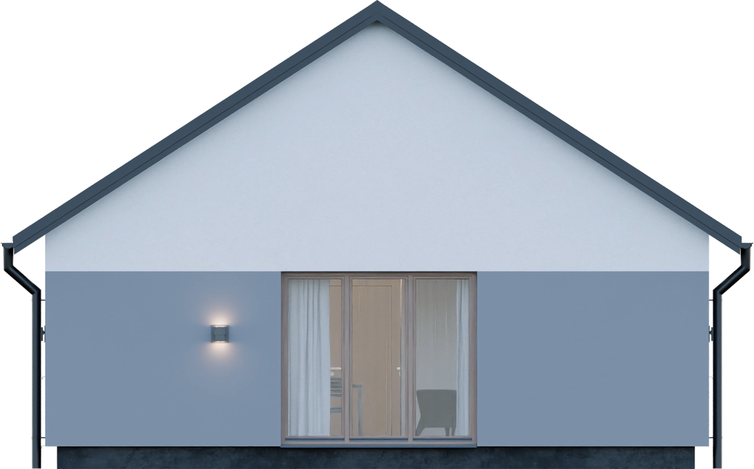 Dom prefabrykowany Parterowy 100D prezentuje tradycyjny styl, który doskonale wpisuje się w różnorodne krajobrazy. Prosta bryła budynku o szerokości elewacji 13,89 m i długości 8,72 m, zwieńczona dwuspadowym dachem o kącie nachylenia 35°, pokrytym blachodachówką, to sprawdzone i ekonomiczne rozwiązanie. Wysokość budynku wynosząca 6,71 m nadaje mu proporcjonalny i harmonijny wygląd. Elewacja, wykonana w technologii prefabrykacji betonowej ze ścianami zewnętrznymi o grubości 15 cm żelbetu i 20 cm styropianu, zapewnia doskonałą izolacyjność termiczną (U ściany 0,16 W/(m•K)), co przekłada się na energooszczędność i komfort cieplny przez cały rok.