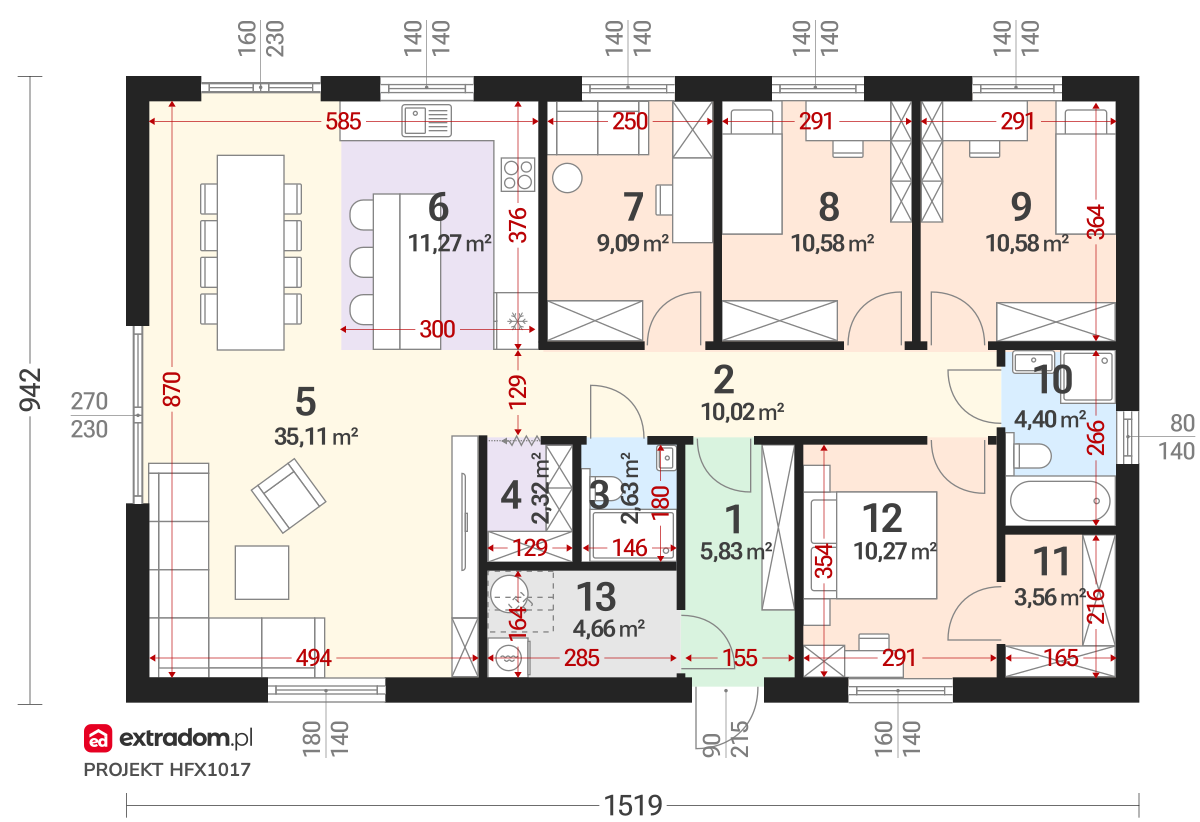 Parter stanowi serce domu, łącząc funkcje dzienne i nocne w przemyślany sposób. Po wejściu przez przestronny wiatrołap (5,83 m²) trafiamy do korytarza (10,02 m²), który prowadzi do wszystkich części domu. Centralnym punktem jest duży pokój dzienny połączony z jadalnią (35,11 m²), tworzący otwartą i jasną przestrzeń do wspólnego spędzania czasu. Tuż obok znajduje się funkcjonalna kuchnia (11,27 m²) z bezpośrednim dostępem do praktycznej spiżarni (2,32 m²), co znacznie ułatwia organizację i przechowywanie. Na parterze zaprojektowano również cztery wygodne pokoje (9,09 m², 10,58 m², 10,58 m² i 10,27 m²), które mogą pełnić funkcję sypialni, pokoi dziecięcych lub gabinetu. Komfort użytkowania zapewniają dwie łazienki (2,63 m² i 4,4 m²), a także praktyczna garderoba (3,56 m²) oraz pomieszczenie gospodarcze (4,66 m²), które zwiększa funkcjonalność domu.