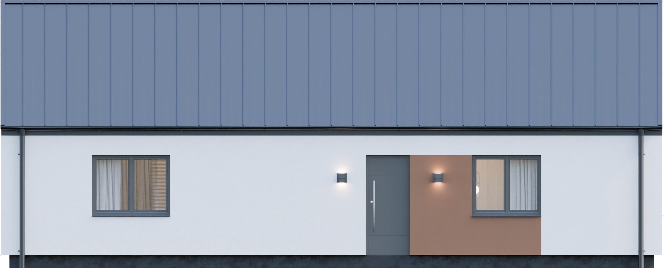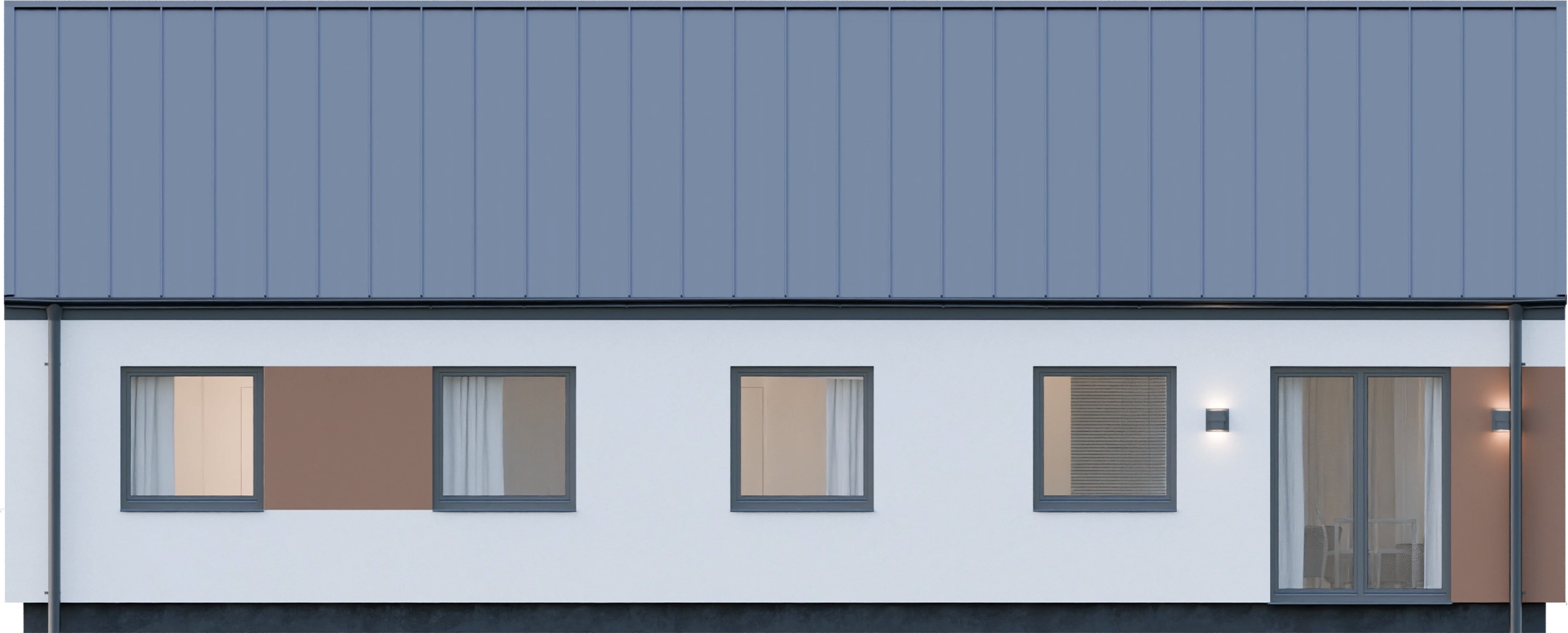 Dom prefabrykowany Parterowy 120C charakteryzuje się nowoczesnym stylem i prostą, elegancką bryłą, która doskonale wpisuje się w otoczenie. Dwuspadowy dach o kącie nachylenia 35° nadaje budynkowi klasyczny, a jednocześnie współczesny wygląd. Elewacja, o szerokości 15,19 m i długości 9,42 m, została zaprojektowana z myślą o estetyce i trwałości, tworząc spójną i harmonijną całość. Wysokość budynku wynosząca 6,71 m podkreśla jego proporcje, a minimalistyczny design sprawia, że dom prezentuje się nowocześnie i ponadczasowo.