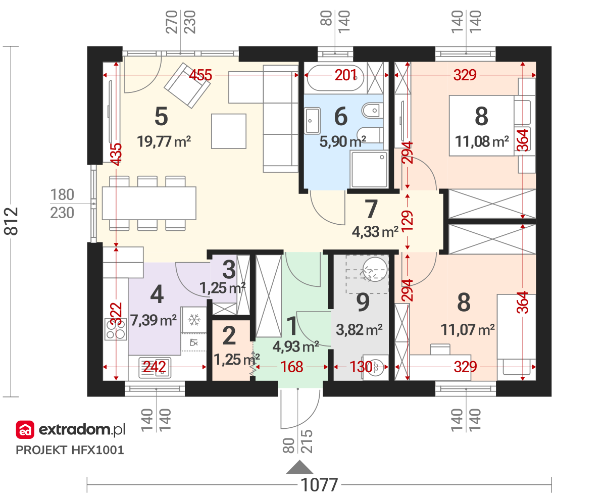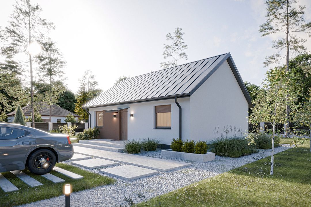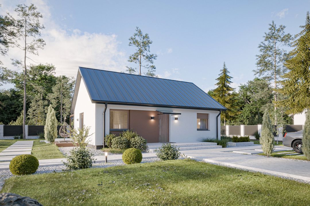Ten parterowy dom o powierzchni użytkowej 70,79 m² oferuje komfortową przestrzeń z dwoma pokojami i jedną łazienką, idealnie dostosowaną do potrzeb rodziny 2+1. Przemyślany układ funkcjonalny zapewnia wygodę i prywatność, dzieląc przestrzeń na strefę dzienną i nocną w ramach jednej kondygnacji.
