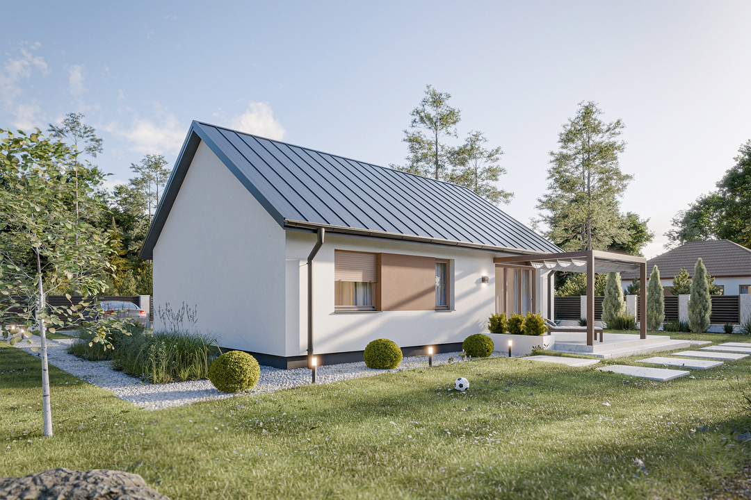 Projekt Dom prefabrykowany Parterowy 70B to kompaktowy i funkcjonalny dom parterowy, idealny dla rodziny 2+1, ceniącej sobie wygodę życia bez schodów. Wykonany w technologii prefabrykatu betonowego, łączy tradycyjny styl z nowoczesnymi rozwiązaniami konstrukcyjnymi, zapewniając szybką realizację i trwałość.