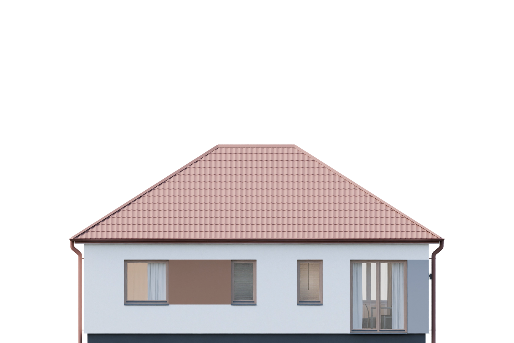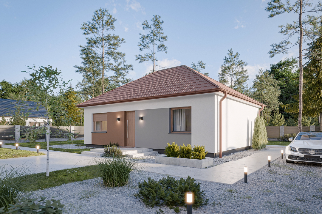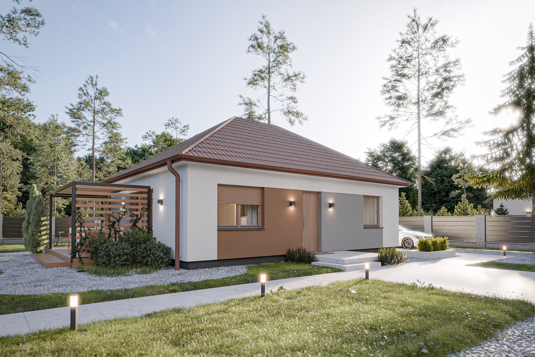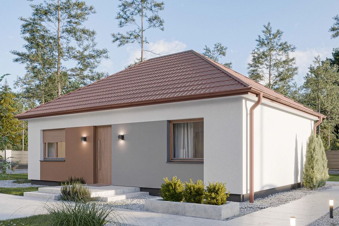 Projekt Dom prefabrykowany Parterowy 70C prezentuje się jako uroczy, parterowy budynek o tradycyjnym charakterze. Jego prosta bryła, zwieńczona eleganckim dachem kopertowym o kącie nachylenia 35°, tworzy harmonijny i ponadczasowy wygląd. Kompaktowe wymiary elewacji (10,77 m szerokości i 8,12 m długości) sprawiają, że dom doskonale wpisuje się nawet w mniejsze działki (minimalna szerokość działki 17,80 m, długość 16,20 m), zachowując jednocześnie pełną funkcjonalność i estetykę.