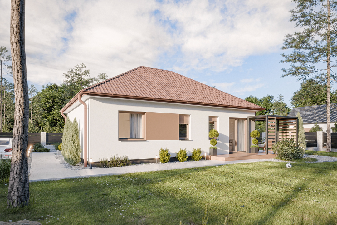 Po przekroczeniu progu, przez wiatrołap i korytarz, wkraczamy do serca domu – przestronnego pokoju dziennego połączonego z jadalnią, który stanowi idealne miejsce do wspólnego spędzania czasu. Tuż obok znajduje się funkcjonalna kuchnia. Strefę prywatną tworzą dwa ustawne pokoje, zapewniające komfortowy wypoczynek. Całość uzupełnia wygodna łazienka oraz praktyczne pomieszczenie gospodarcze, które ułatwia utrzymanie porządku.