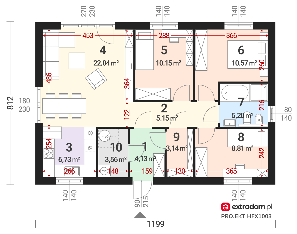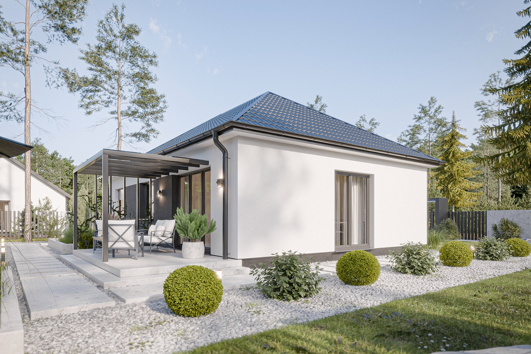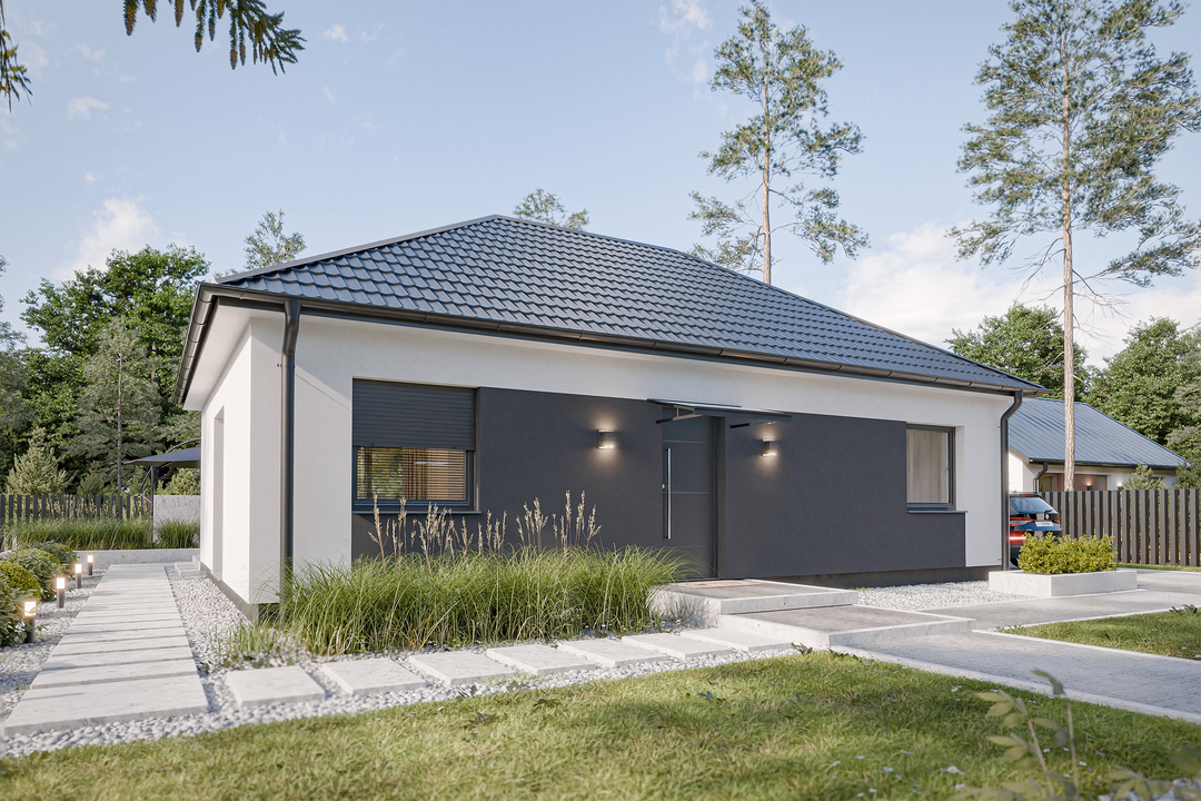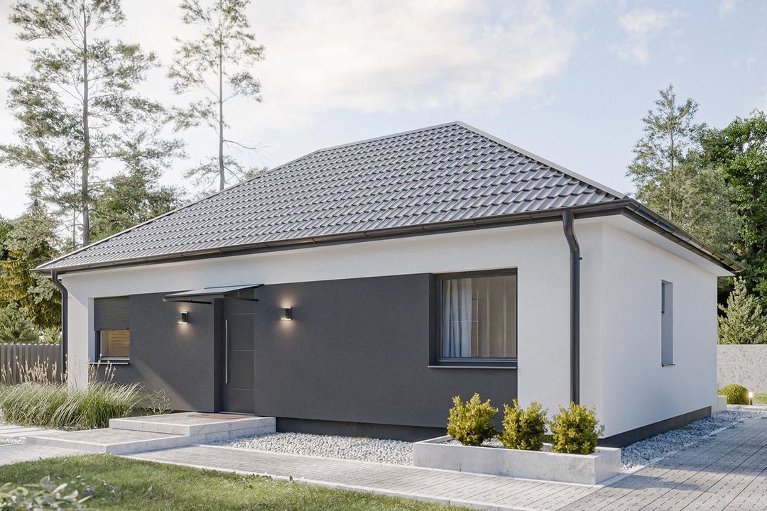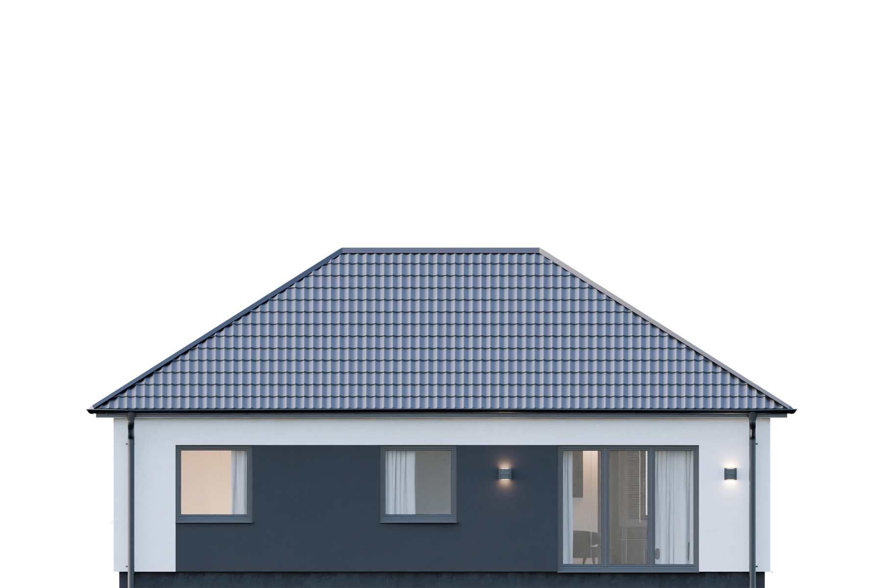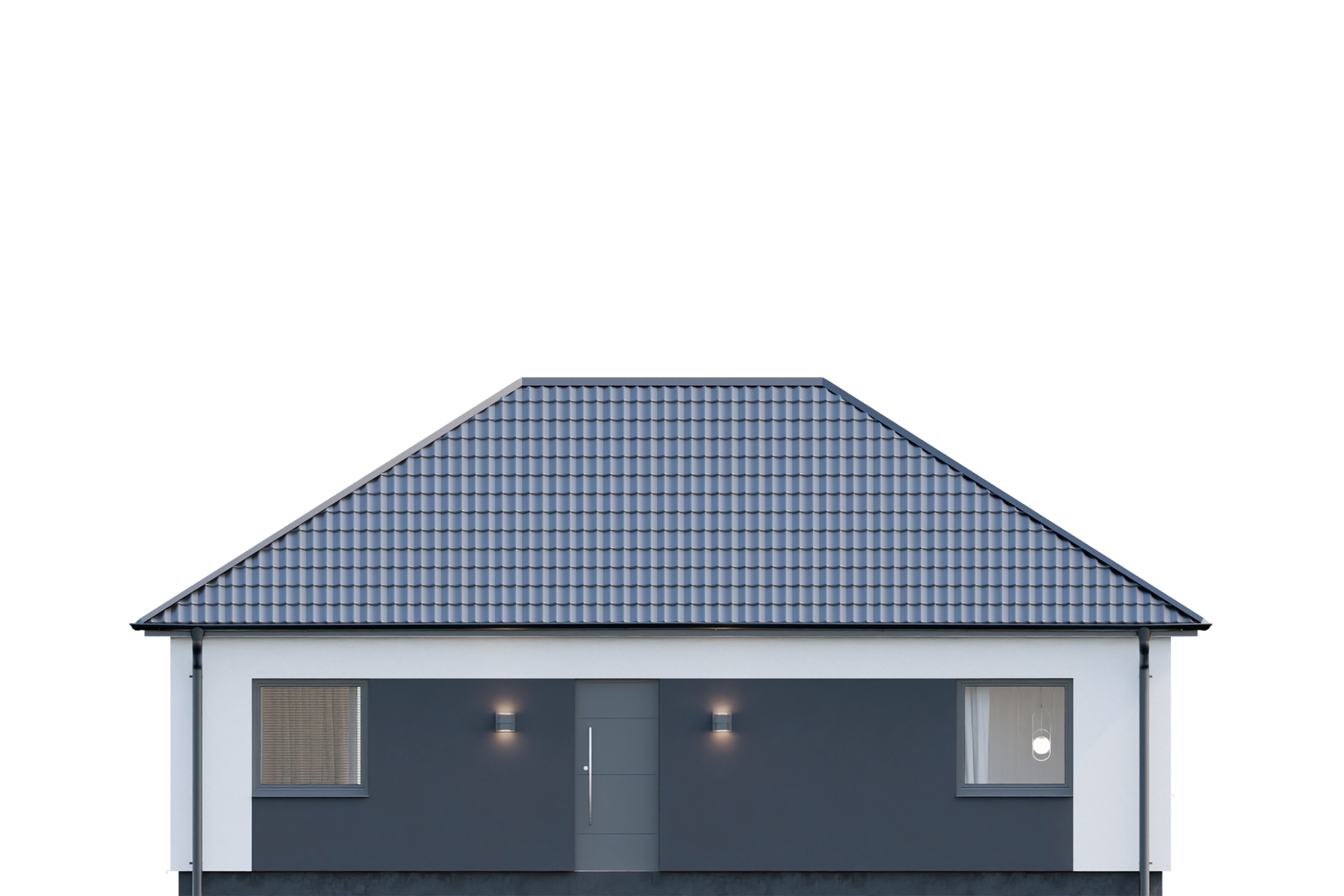 Projekt Dom prefabrykowany Parterowy 80A to urokliwy dom wolnostojący, którego architektura harmonijnie wpisuje się w tradycyjny krajobraz. Prosta, parterowa bryła o wymiarach 11,99 m szerokości i 8,12 m długości elewacji, zwieńczona jest eleganckim dachem kopertowym o kącie nachylenia 35°. Całość tworzy spójną i estetyczną kompozycję o wysokości 6,50 m, która mimo swojej kompaktowości, prezentuje się solidnie i ponadczasowo.