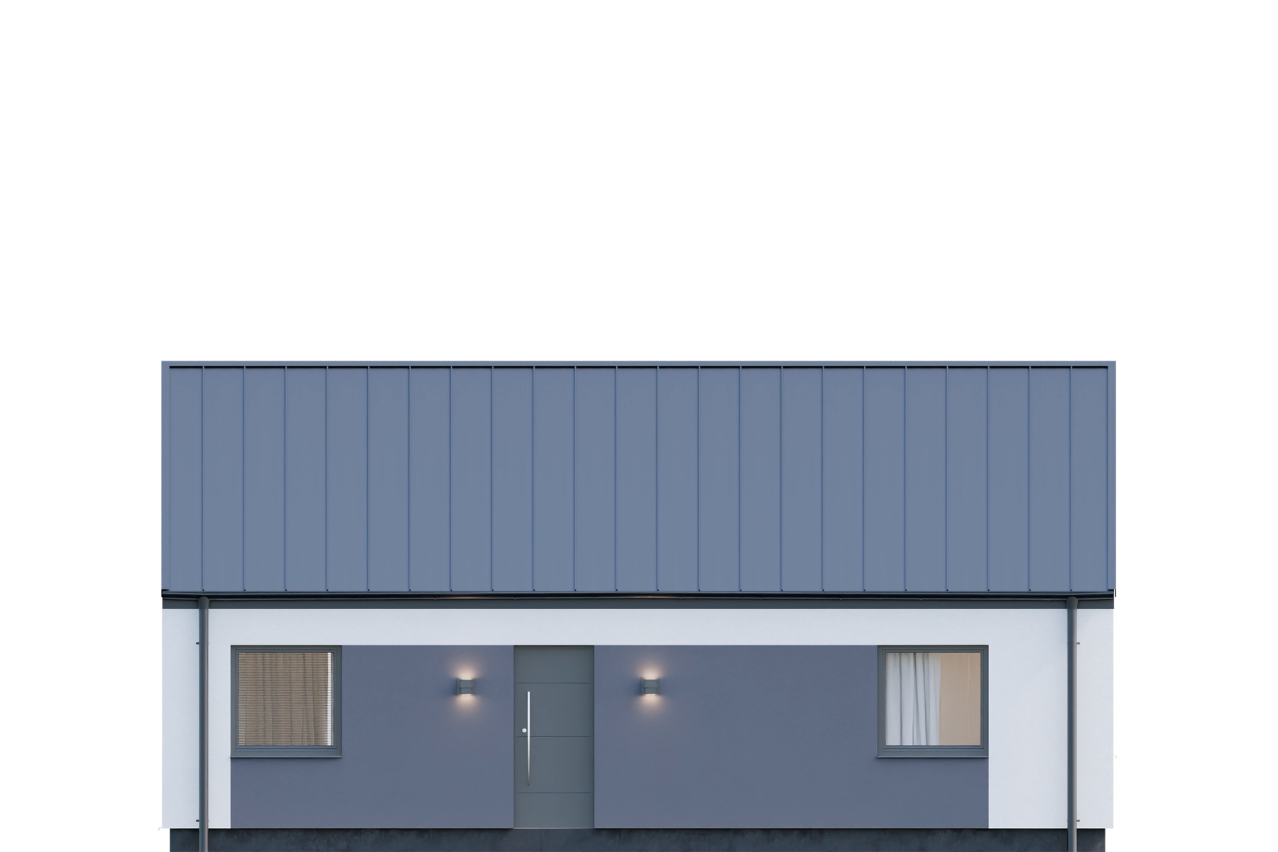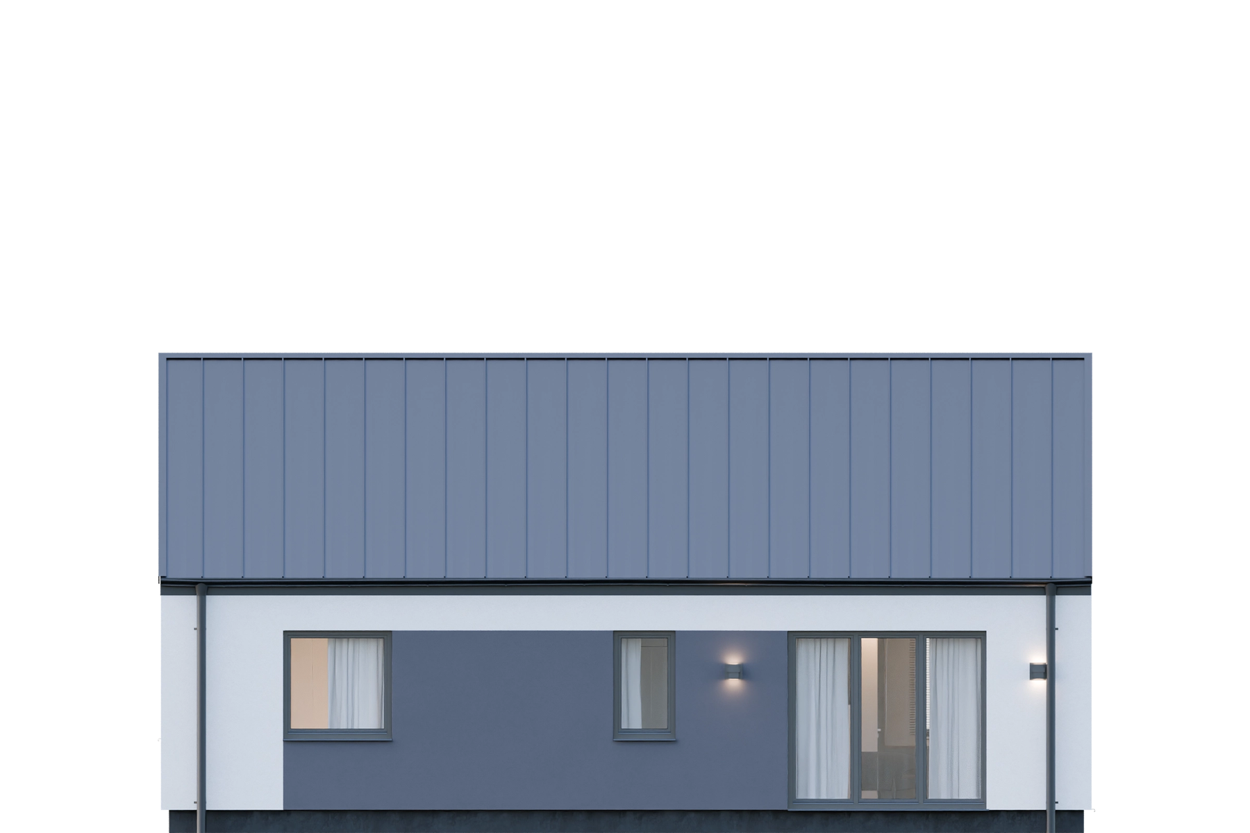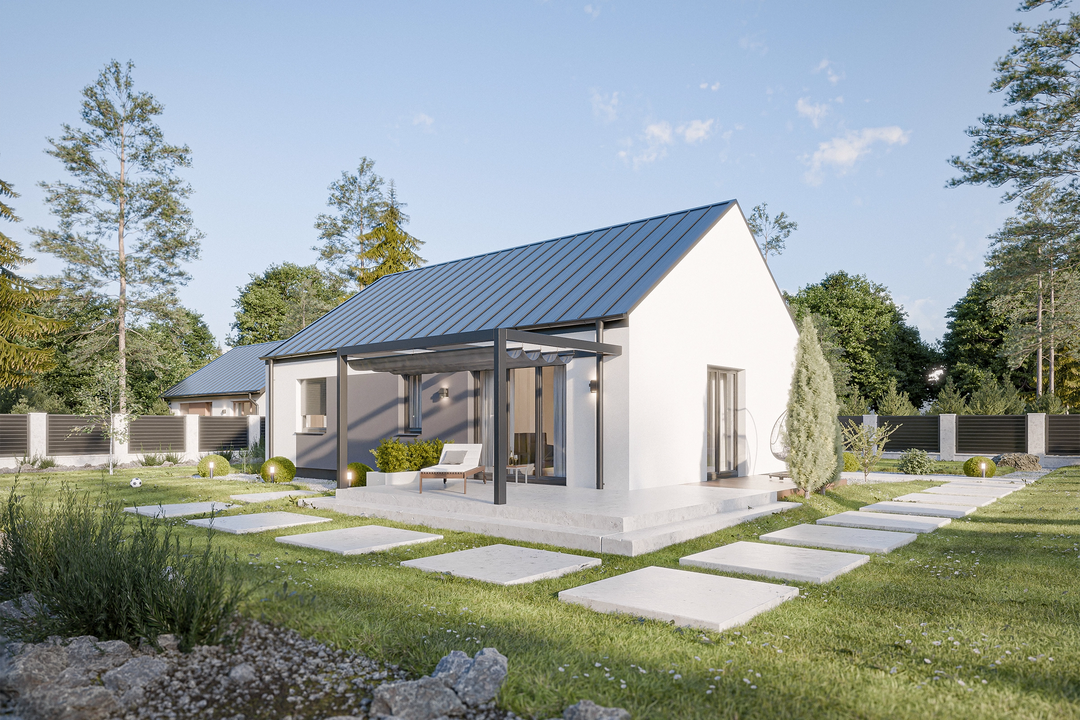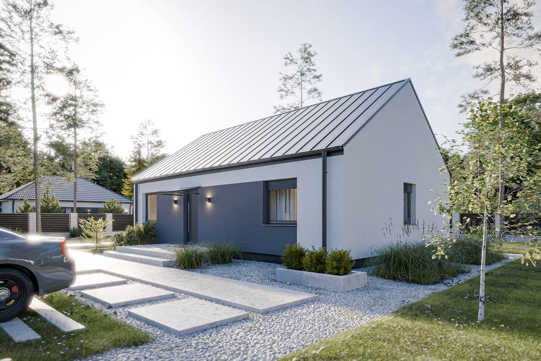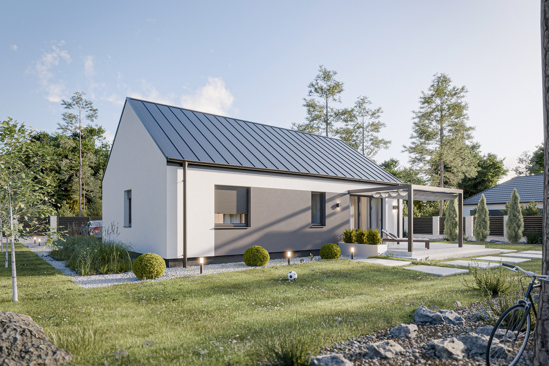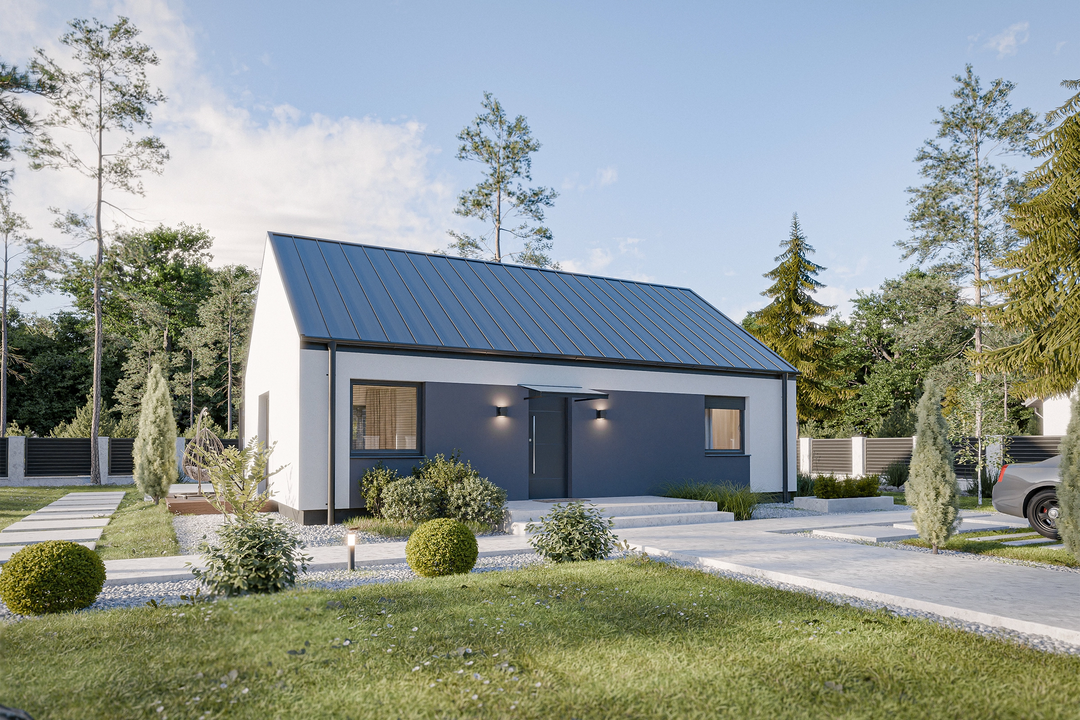 Projekt Dom prefabrykowany Parterowy 80B charakteryzuje się prostą, zwartą bryłą z dwuspadowym dachem o kącie nachylenia 35°. Taka konstrukcja, wpisująca się w tradycyjny styl, jest nie tylko estetyczna, ale również ekonomiczna w budowie i eksploatacji. Klasyczny wygląd elewacji harmonijnie komponuje się z otoczeniem, tworząc przytulne i ponadczasowe miejsce do życia. Wysokość budynku wynosząca 6,50 m oraz szerokość elewacji 11,99 m i długość 8,12 m sprawiają, że dom doskonale odnajdzie się na działkach o minimalnej szerokości 20 m i długości 16,20 m.