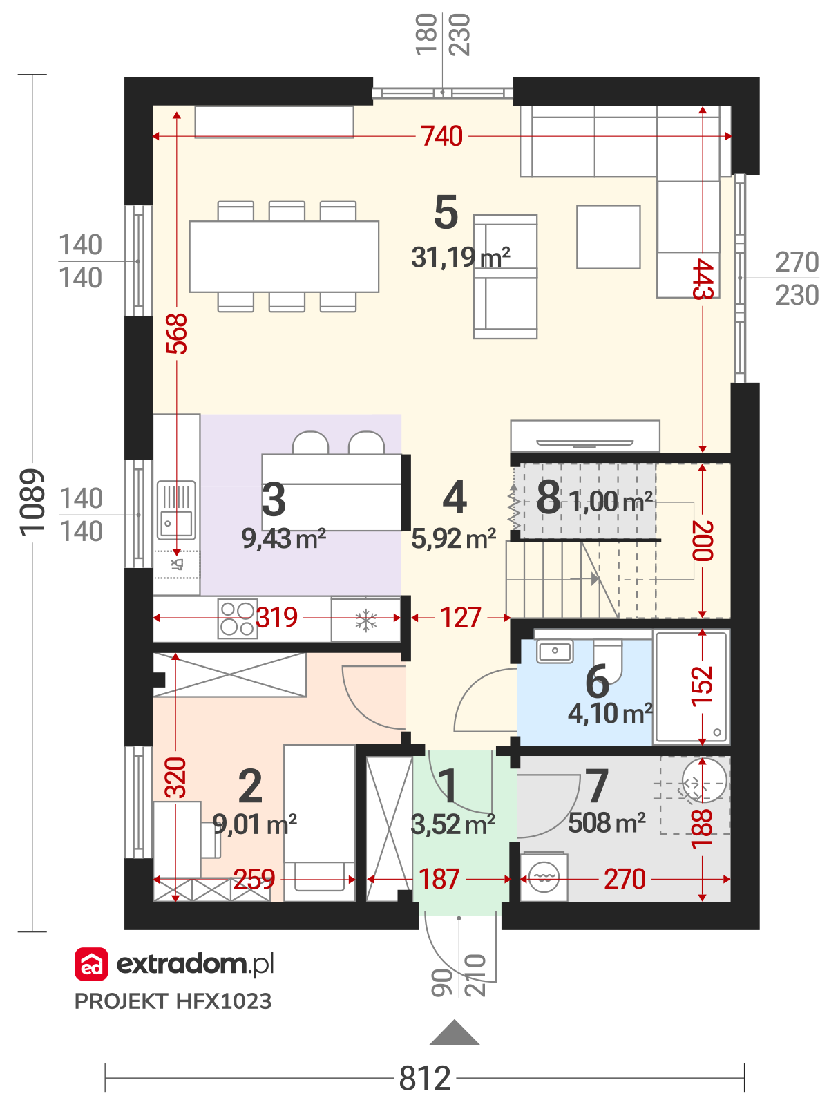 Parter o powierzchni 69,25 m² to serce domu, zaprojektowane z myślą o codziennym życiu i spotkaniach rodzinnych. Już od progu wita nas funkcjonalny wiatrołap (3,52 m²), z którego przechodzimy do korytarza ze schodami (5,92 m²), prowadzącego do przestronnego pokoju dziennego połączonego z jadalnią (31,19 m²), który stanowi idealne miejsce do relaksu i wspólnych posiłków. Tuż obok znajduje się wygodna kuchnia (9,43 m²), sprzyjająca kulinarnym pasjom. Dodatkowy pokój (9,01 m²) na parterze oferuje elastyczną przestrzeń, którą można zaadaptować na gabinet, pokój gościnny lub sypialnię. Całość uzupełnia praktyczna łazienka (4,1 m²) oraz dwa pomieszczenia gospodarcze (5,08 m² i 1,0 m²), zapewniające miejsce na przechowywanie i techniczne zaplecze domu.