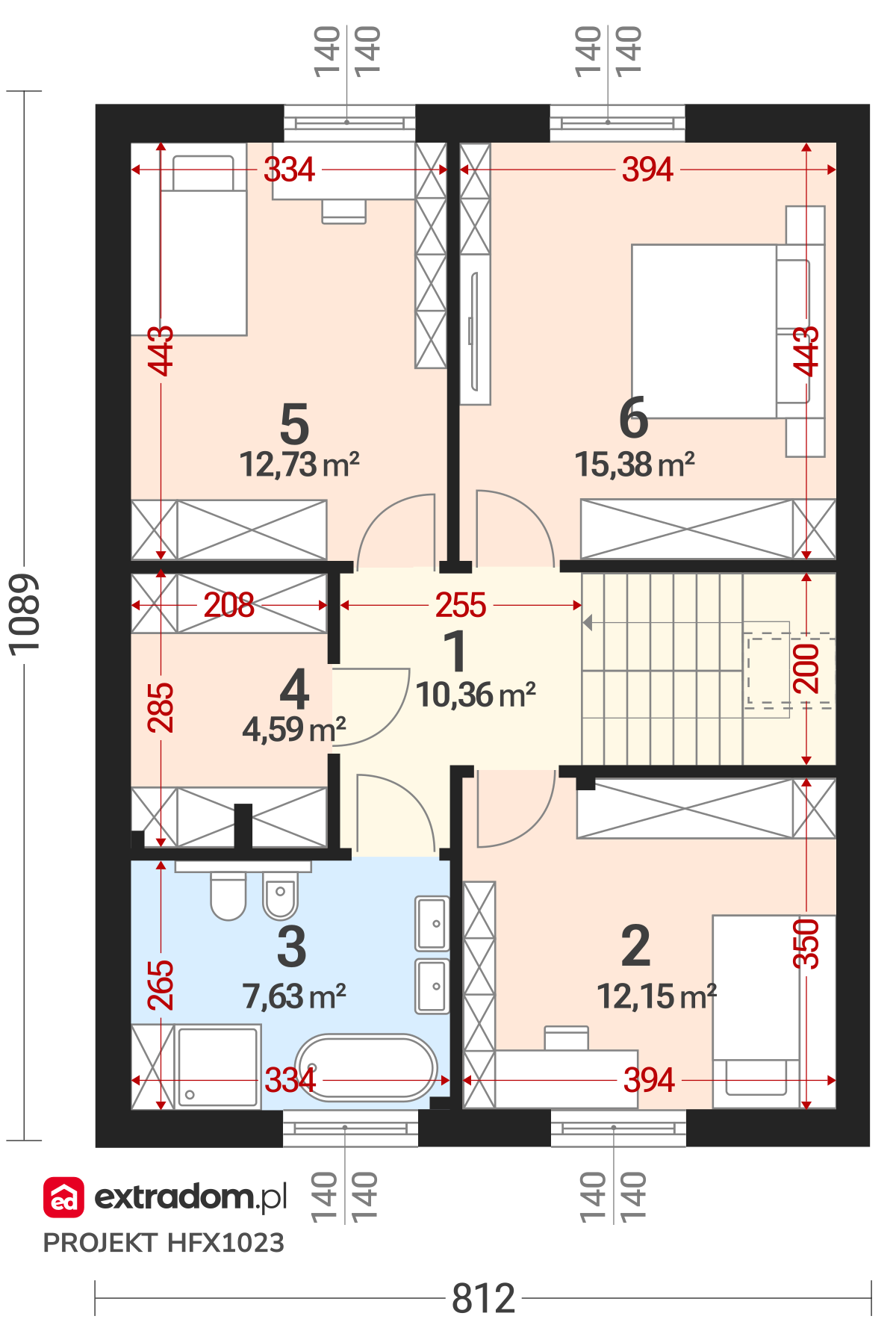 Poddasze o powierzchni 62,84 m² to prywatna oaza spokoju, dedykowana wypoczynkowi. Centralny korytarz ze schodami (10,36 m²) prowadzi do trzech komfortowych pokoi (12,15 m², 12,73 m² i 15,38 m²), które z łatwością pomieszczą sypialnie dla dzieci i rodziców. Duża łazienka (7,63 m²) na tej kondygnacji zapewnia wygodę wszystkim domownikom, a praktyczna garderoba (4,59 m²) to idealne rozwiązanie na przechowywanie ubrań i utrzymanie porządku, eliminując potrzebę dużych szaf w sypialniach.