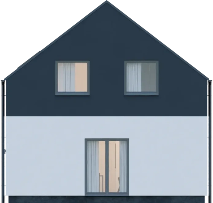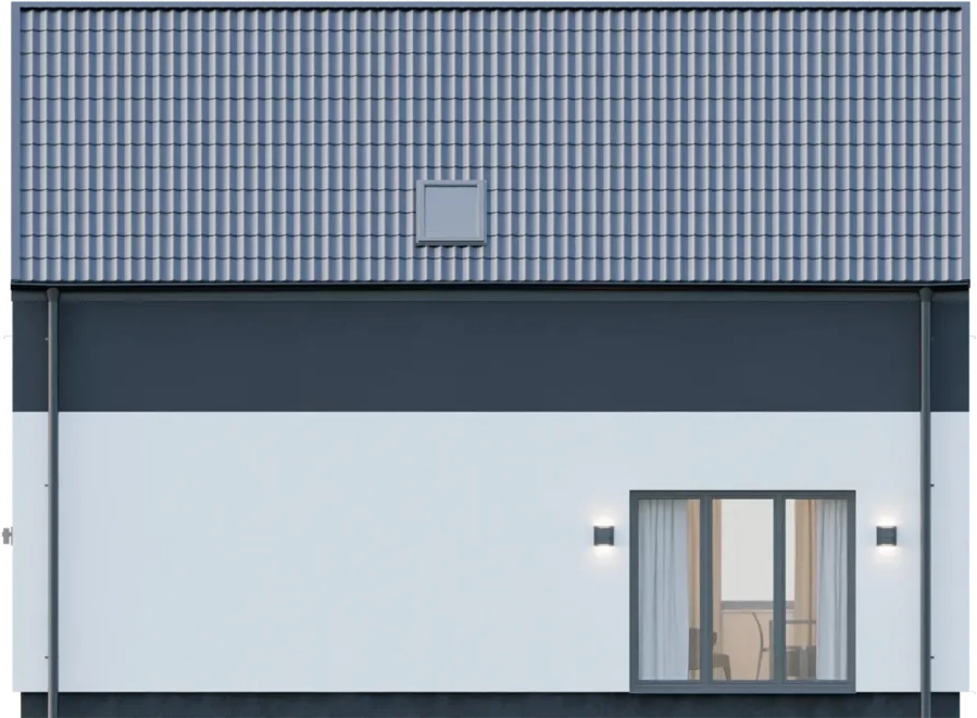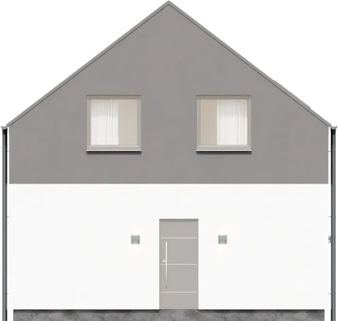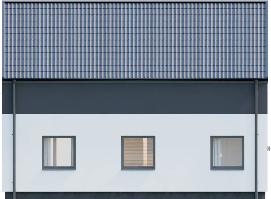 Dom prefabrykowany Piętrowy 130C charakteryzuje się prostą, piętrową bryłą, która doskonale wpisuje się w nowoczesne trendy architektoniczne. Dwuspadowy dach o kącie nachylenia 35°, pokryty blachodachówką, nadaje budynkowi klasyczną elegancję, jednocześnie zapewniając trwałość i odporność na warunki atmosferyczne. Elewacja, wykonana w technologii prefabrykatu betonowego, gwarantuje estetyczny wygląd i solidność konstrukcji. Wysokość budynku wynosząca 7,70 m oraz kompaktowe wymiary elewacji (8,12 m szerokości i 10,89 m długości) sprawiają, że projekt jest idealny na działki o minimalnej szerokości 16,20 m i długości 18,90 m.