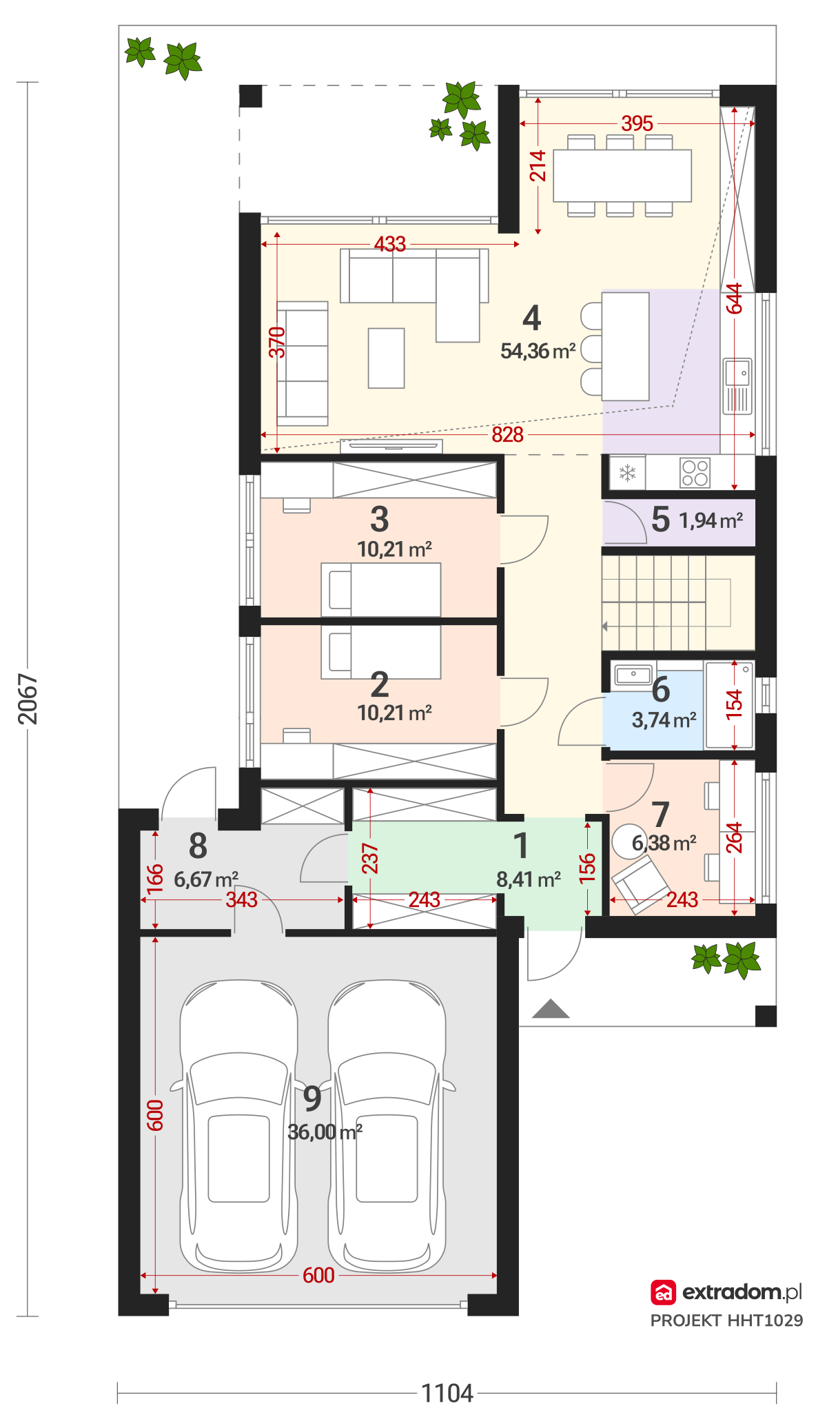 - Pokój dzienny + kuchnia + jadalnia – 54,36 m²