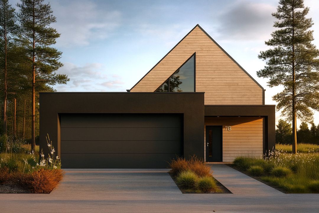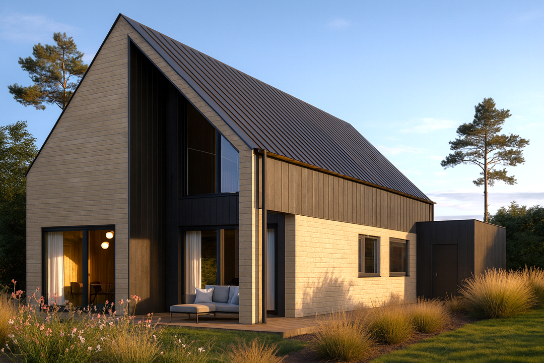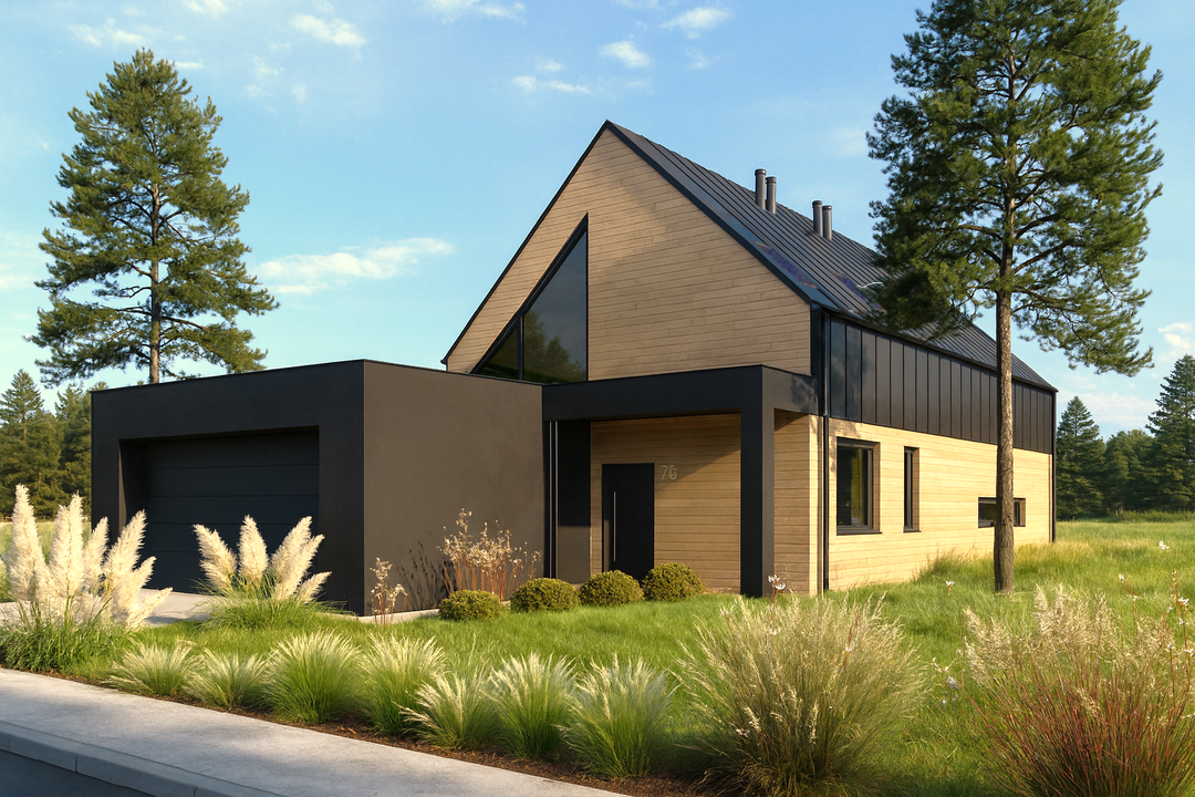 Dom szkieletowy Open Sky 195 wyróżnia się prostą, ale elegancką bryłą, która doskonale wpisuje się w nowoczesne trendy architektoniczne. Dwuspadowy dach o kącie nachylenia 40°, pokryty blachą na rąbek, nadaje budynkowi wyrazisty charakter. Elewacja wykonana z drewna podkreśla naturalny i ciepły wygląd, jednocześnie zapewniając trwałość i estetykę.