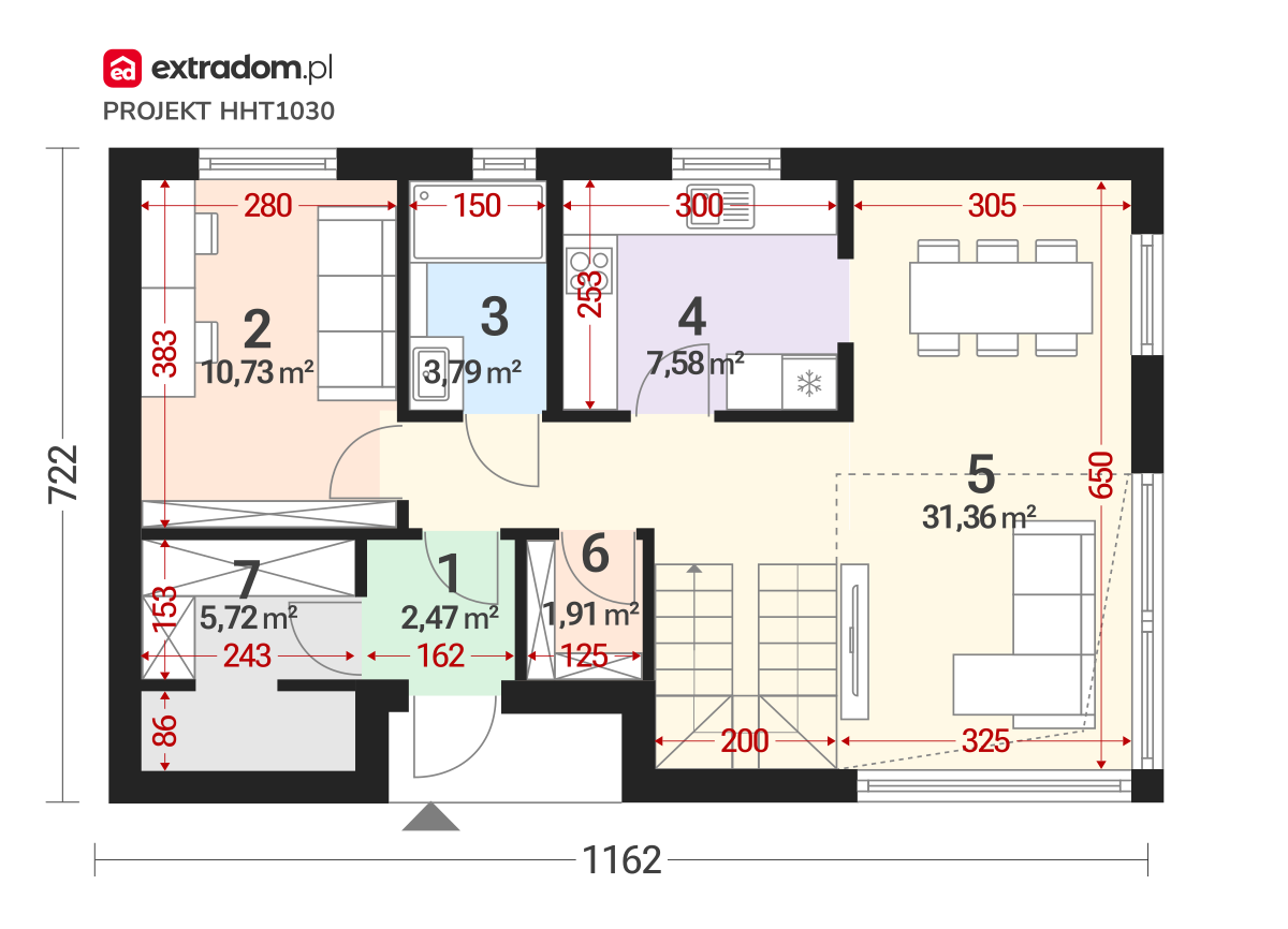 - Pomieszczenie gospodarcze – 5,72 m²
